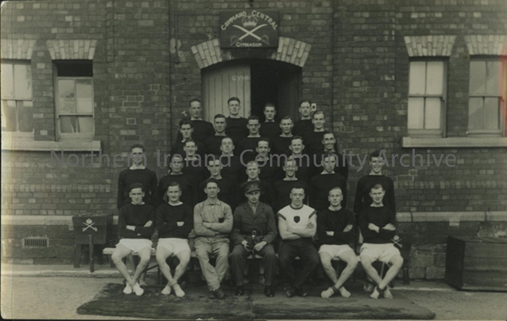Group of soldiers in sportswear pictured outside a building with a sign "Command Central Gymnasium" in Belfast.