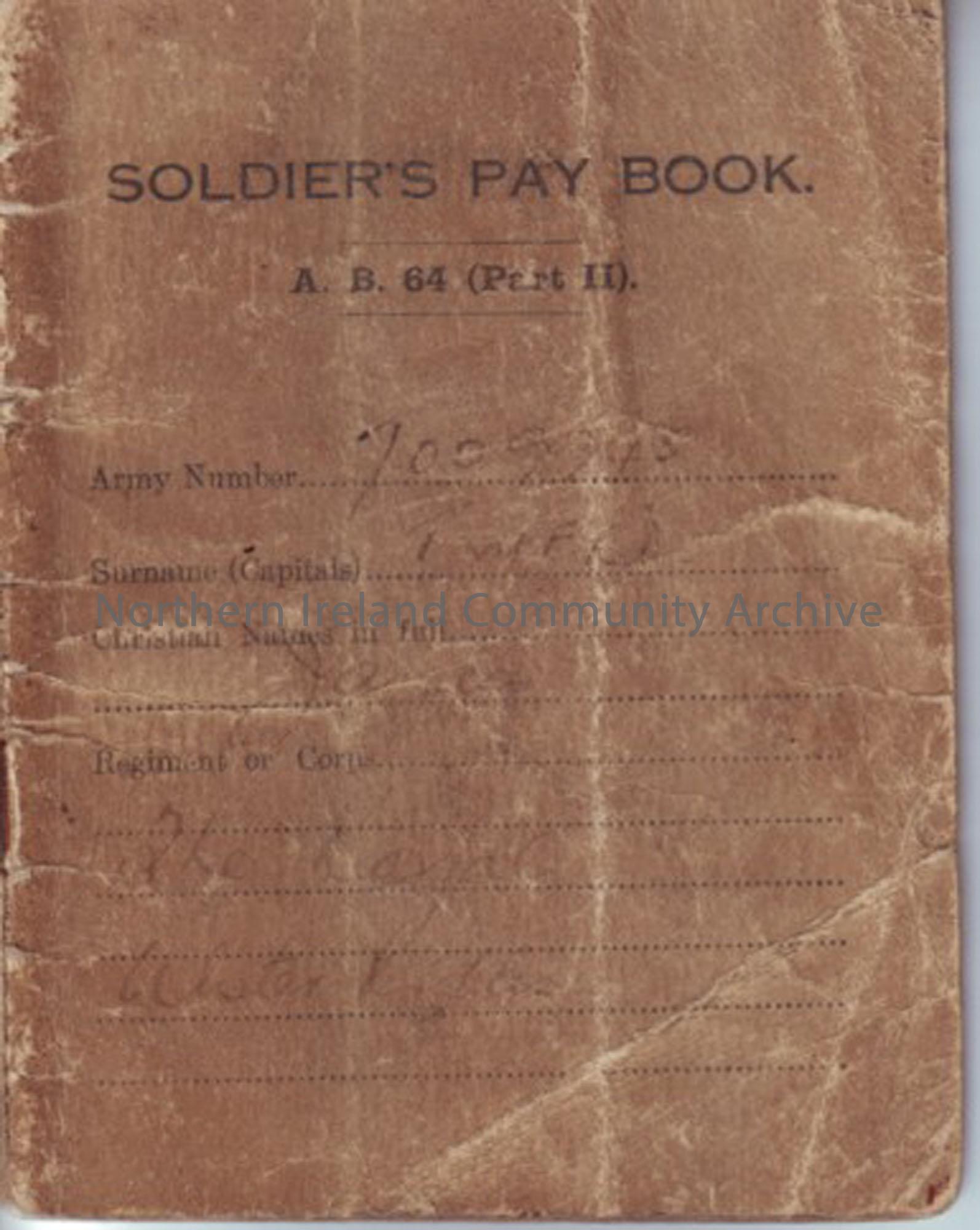 Soldiers' Pay Book belonging to James Tweed. Brown with black writing and a form on the cover.