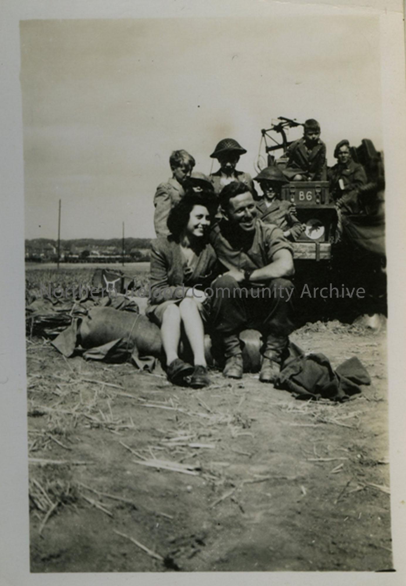 Soldier (John Hamill) and woman seated with 3 children behind. SP Bofors gun in the background.