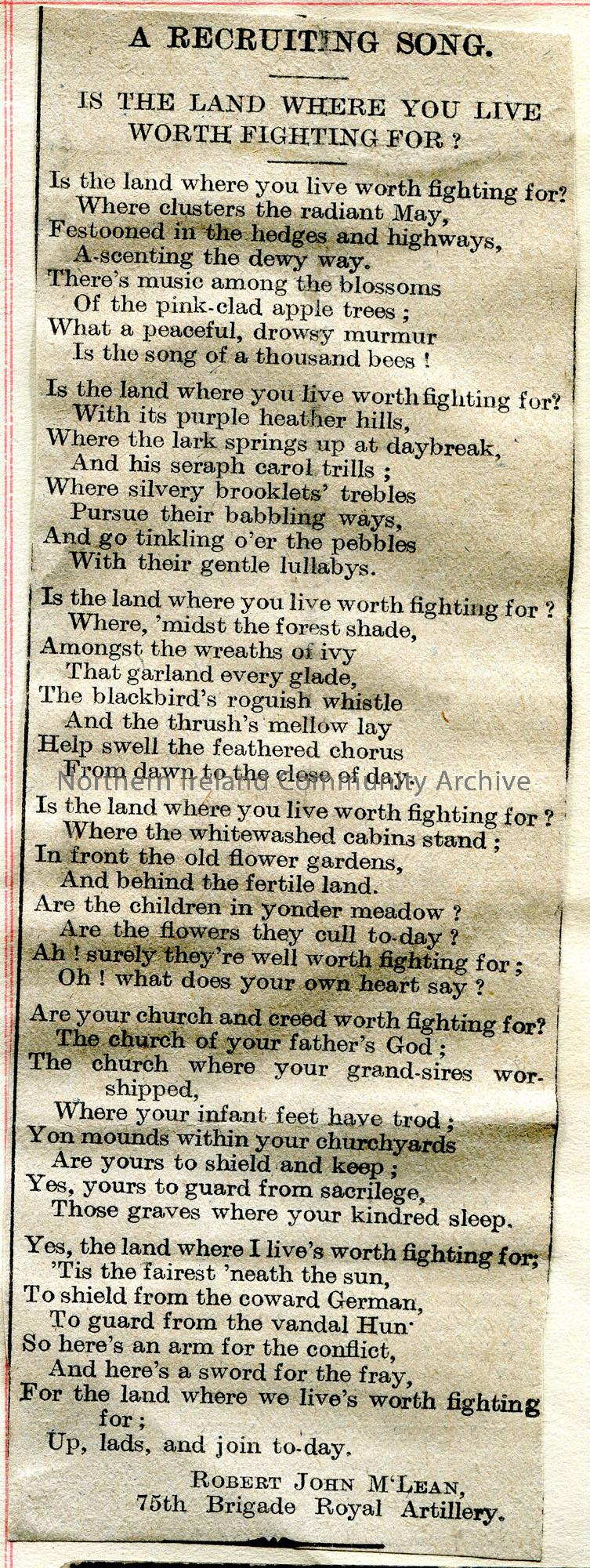 Song cut from a newspaper. Titled, ‘A Recruiting Song. Is The Land Where You Live Worth Fighting For?’ By Robert John McClean of 75th Brigade Royal Ar…