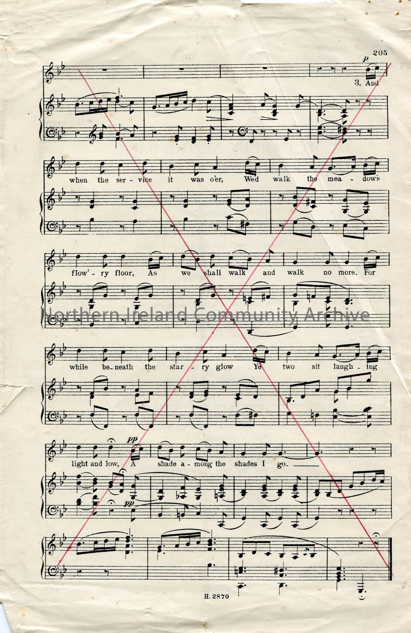 Song or words to a poem titled, 'My Garden At The Back'. Page pulled from a book. Sheet music on other side of page with cross through it. Re a move from Rosstrevor to London, leaving behind Kate from County Down.