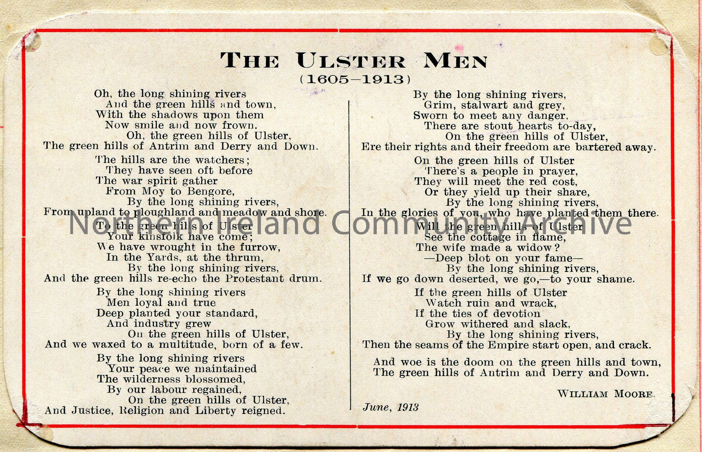 Song printed onto postcard with red border titled, 'The Ulster Men (1605-1913)' by William Moore. Dated June 1913.