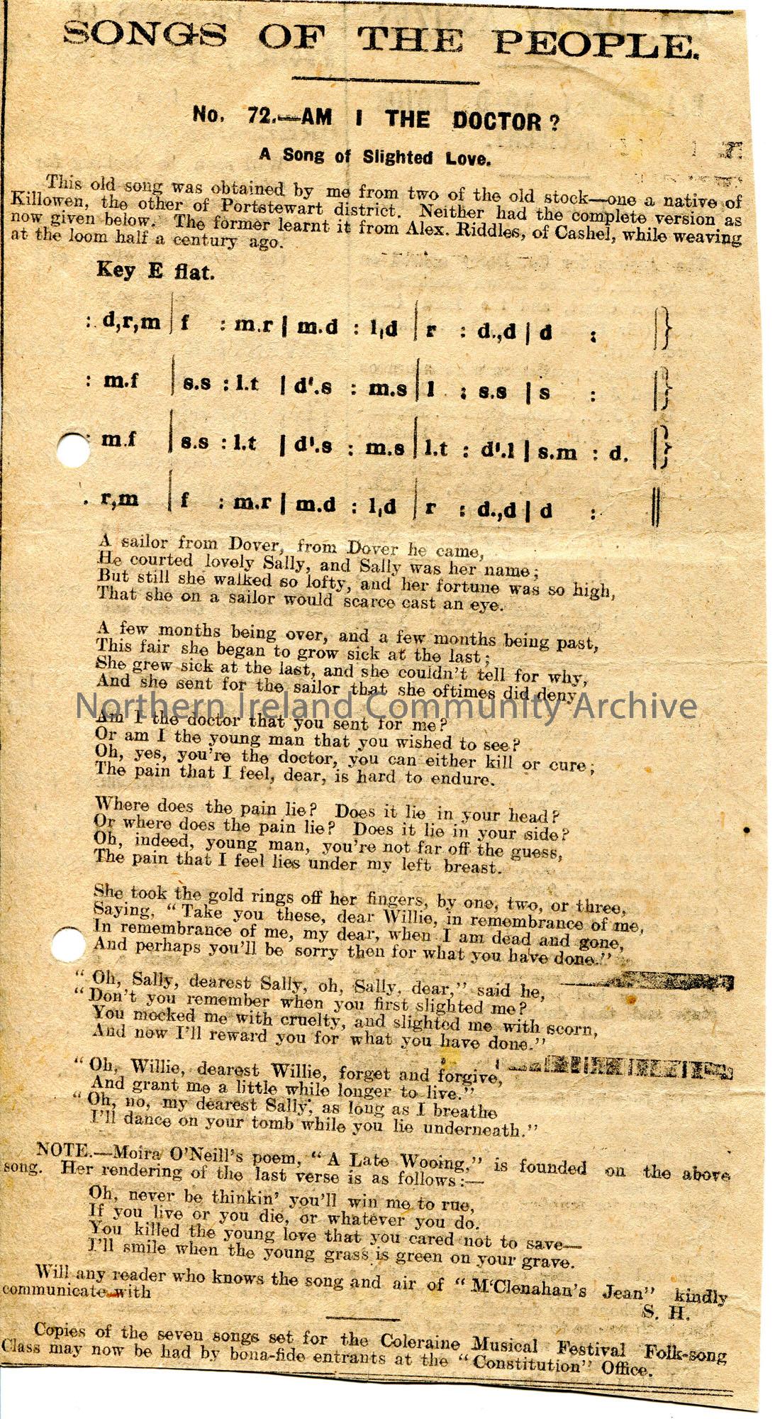 Song words and tonic sol-fa from 'Songs of the People' printed in the Northern Constitution. No. 72 'Am I The Doctor? A Song of Slighted Love'. Song from persons of Killowen and Portstewart. Learnt from Alex Riddles, Cashel, while weaving at the loom half a century ago.
