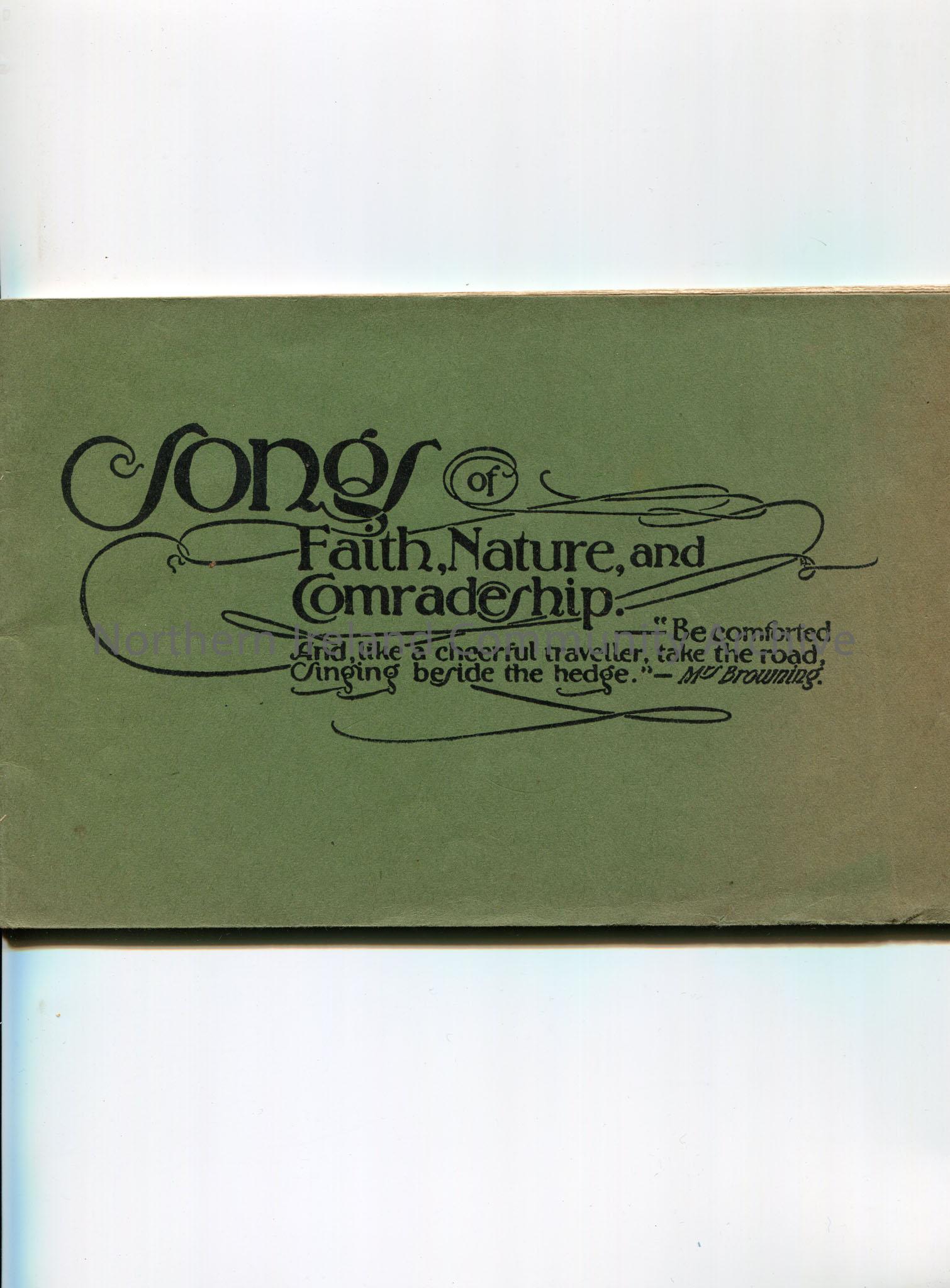 'Songs of Faith, Nature and Comradeship'. Green cover. Published by the Co-operative Holidays Association, in connection with the National Home Reading Union. Manuscript of songs.