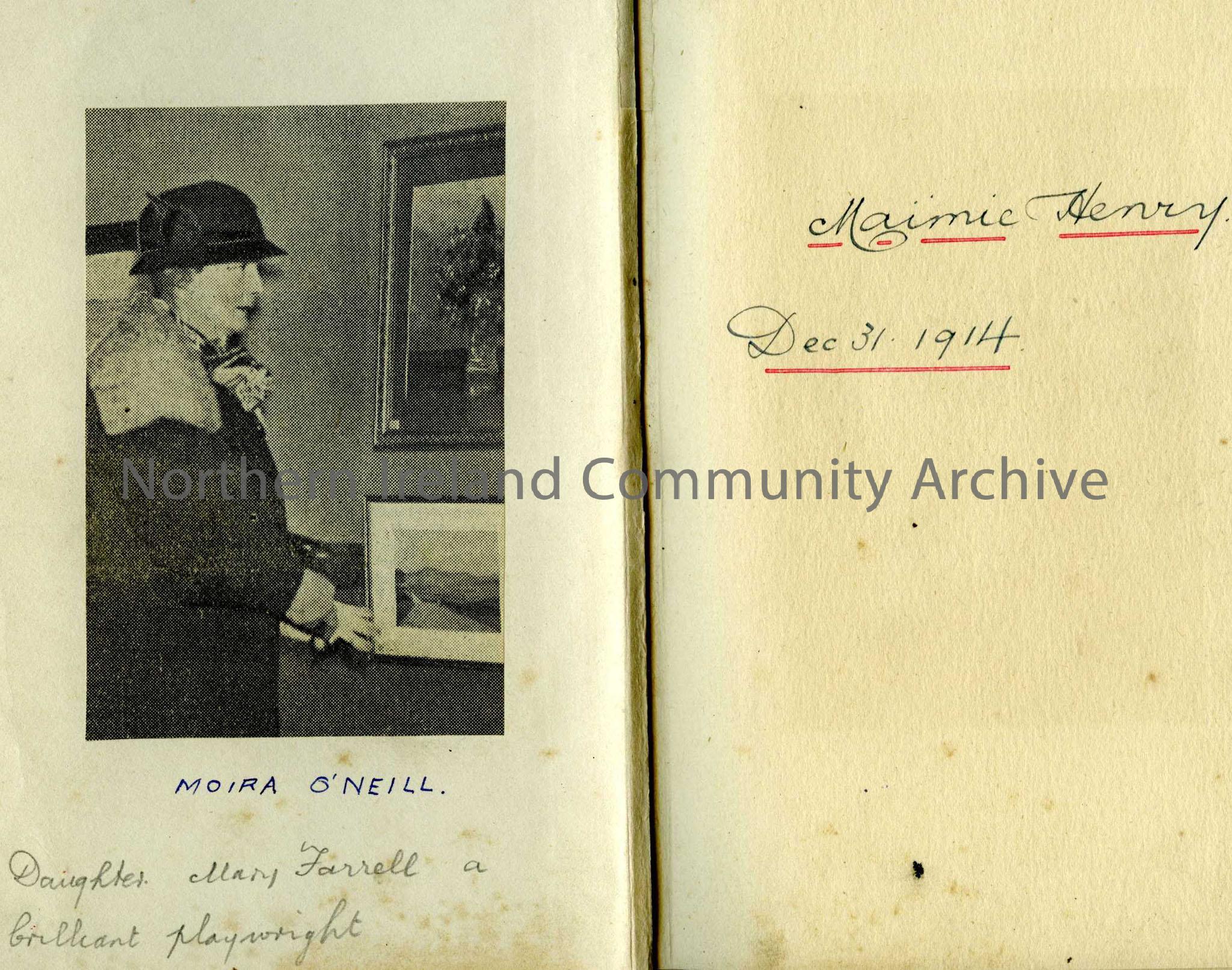 Songs of the Glens - book of poems about the Glens of Antrim. Sam Henry has affixed photos on strategic pages throughout the book - see attached. Also, handwritten on back page - the poem The Late Wooing by O'Neill. The earliest copy of this book in the collection