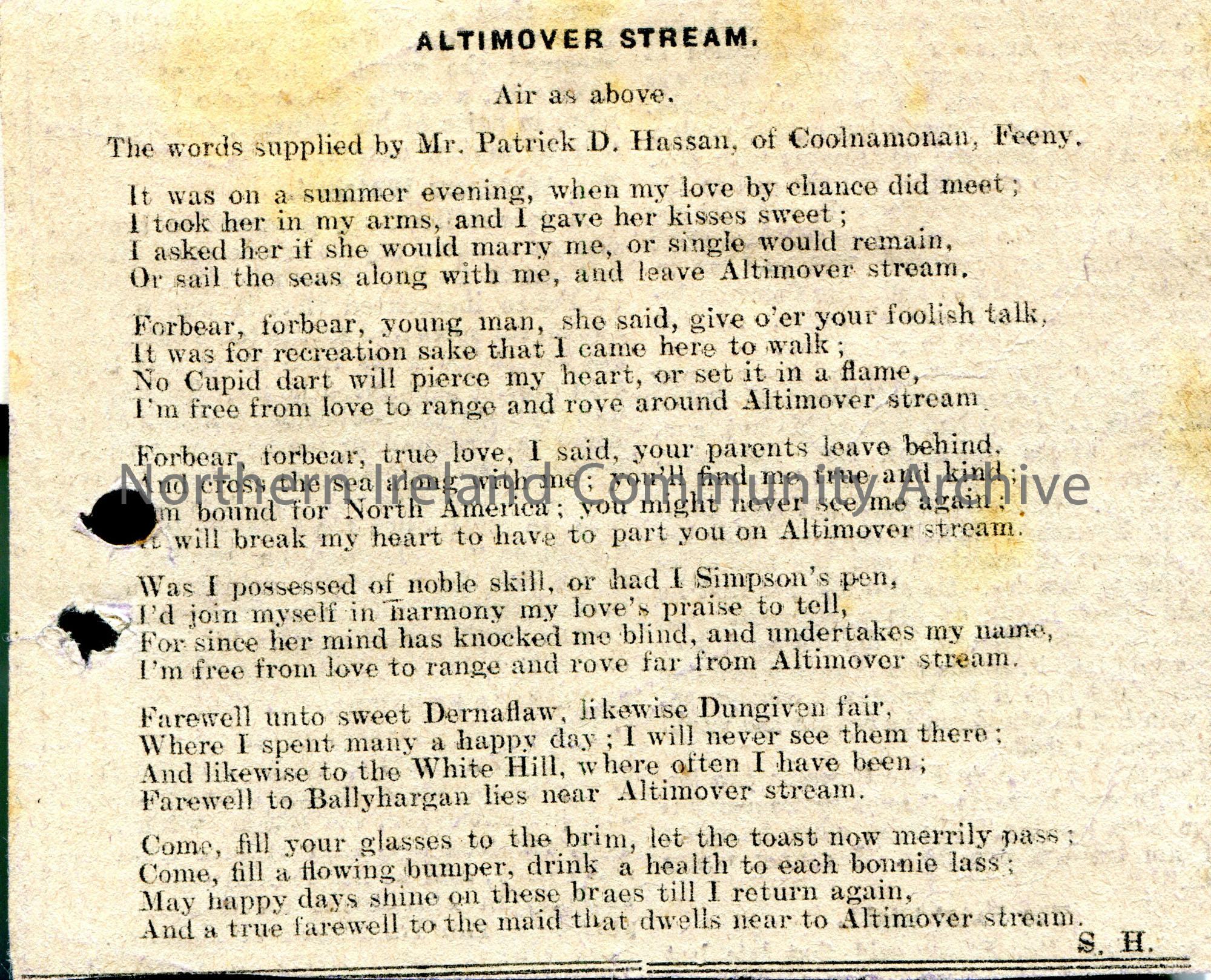 Songs of the People article cut from the Northern Constitution newspaper. Re song titled, 'No. 65 - Monk McClamont's "Farewell to Articlave". Note on Monk McClamont. Air has been adapted to various songs - The Shepherd's Boy, Bathing in the Roe, The Purple Man's Dream and Altimover Stream. The words to Altimover Stream are also included in the article.