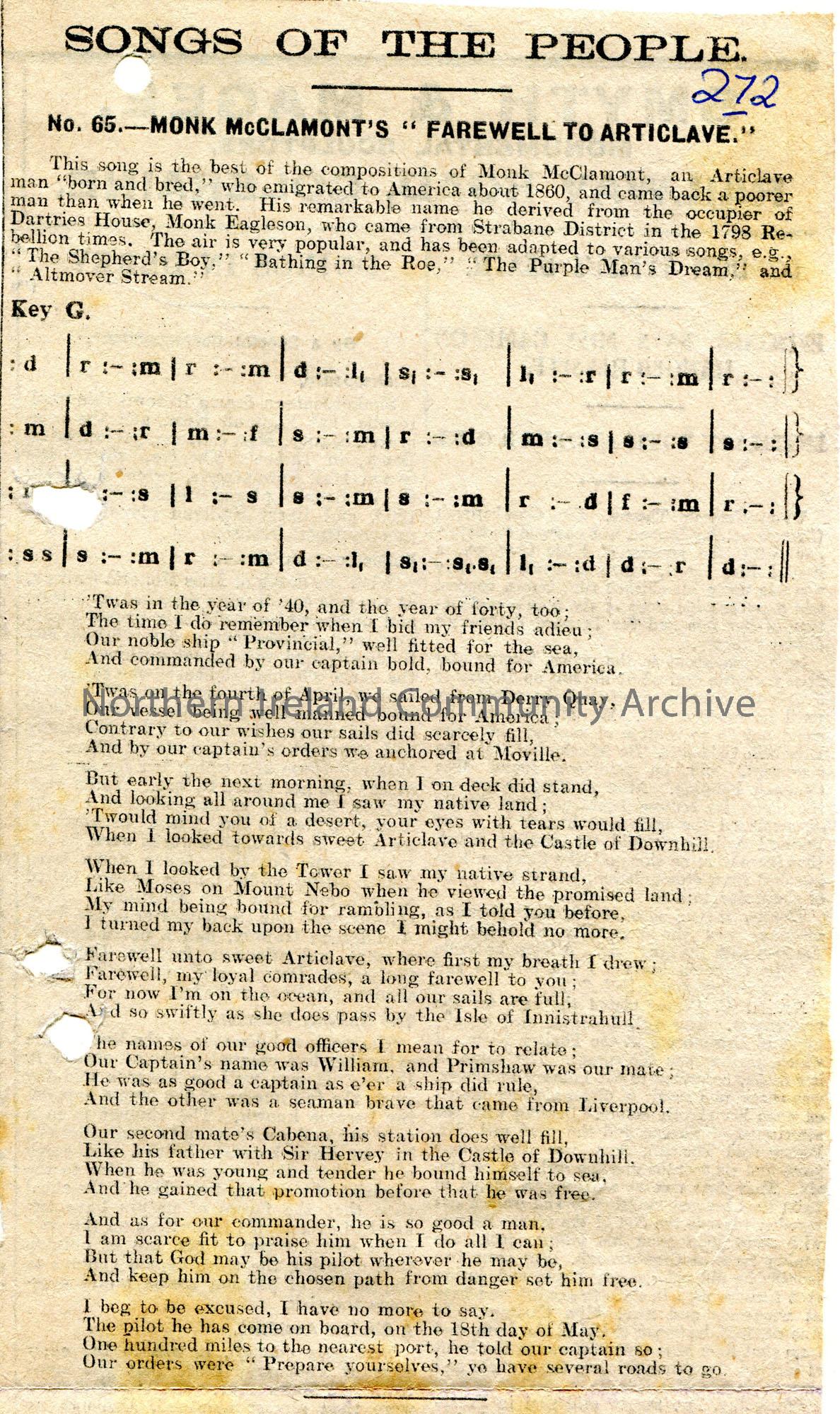 Songs of the People article cut from the Northern Constitution newspaper. Re song titled, 'No. 65 - Monk McClamont's "Farewell to Articlave". Note on Monk McClamont. Air has been adapted to various songs - The Shepherd's Boy, Bathing in the Roe, The Purple Man's Dream and Altimover Stream. The words to Altimover Stream are also included in the article.