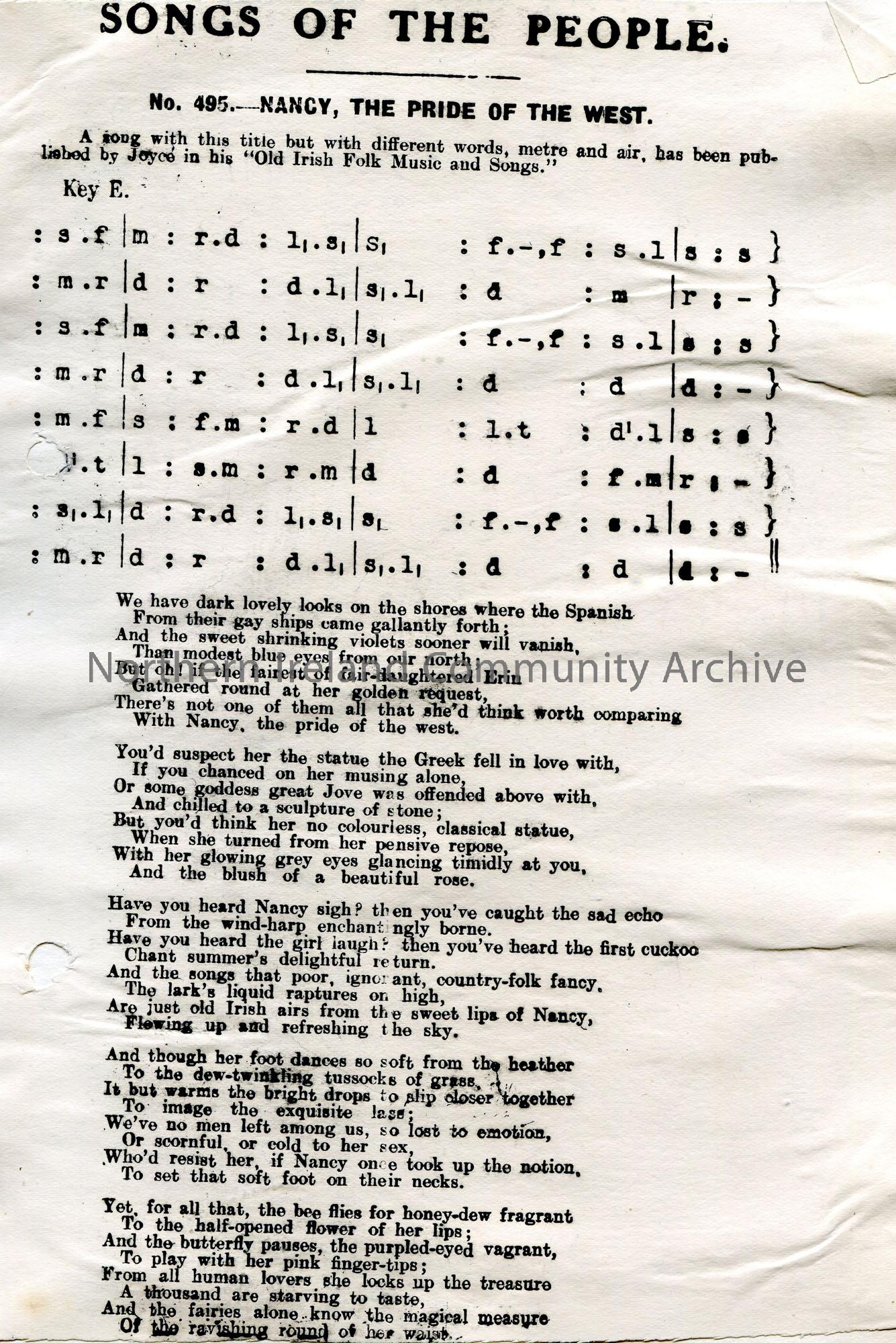 Songs of the People article of a tonic sol-fa and words to song titled, ‘No. 495 – Nancy, The Pride of the West’.