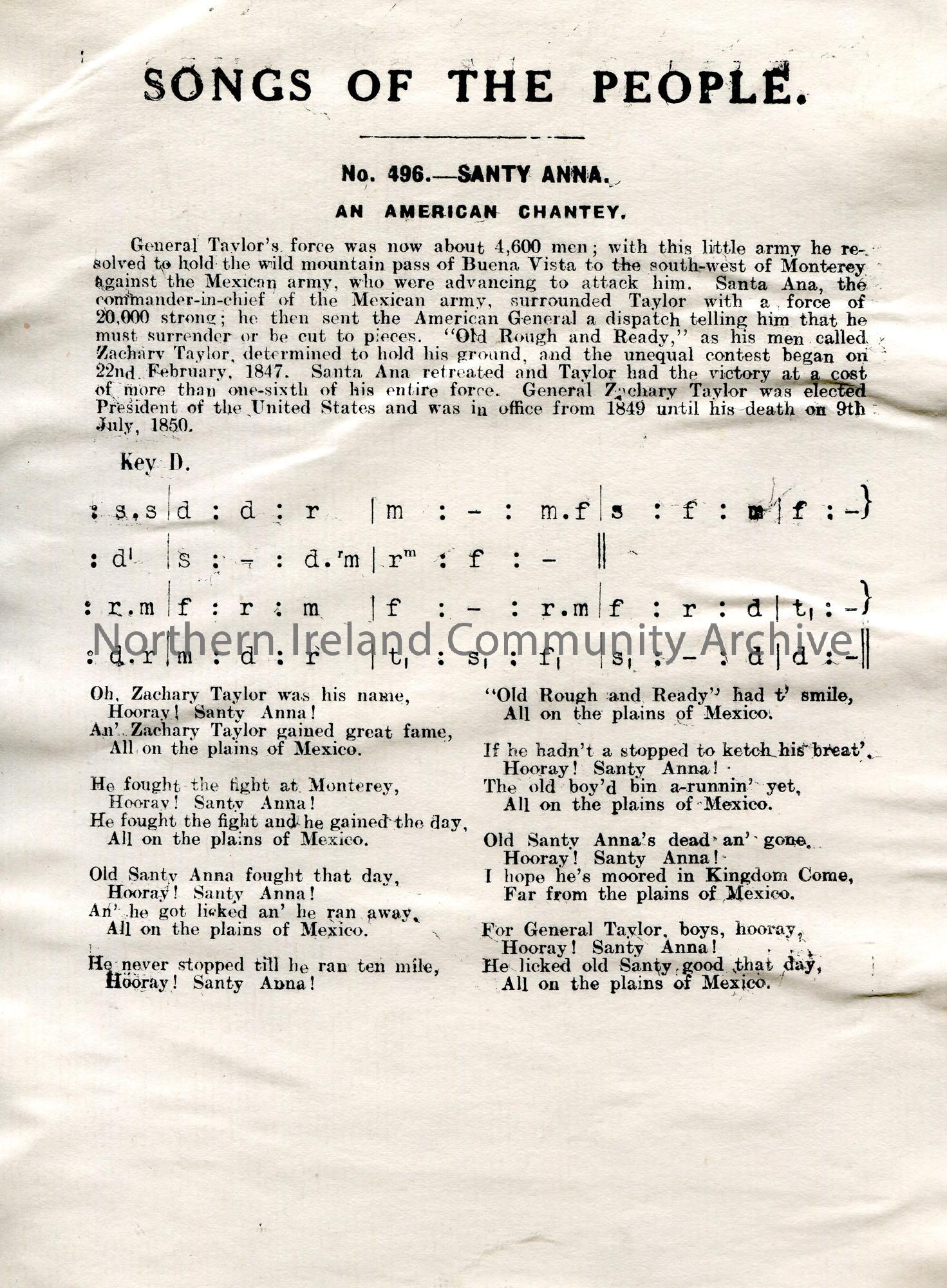 Songs of the People article of a tonic sol-fa and words to song titled, ‘No. 496 – Santy Anna. An American Chantey’.