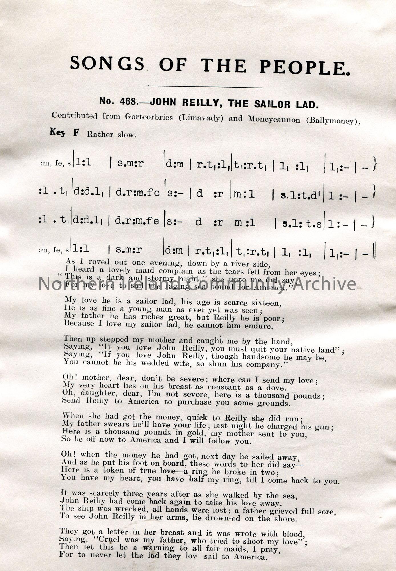 Songs of the People article of a tonic sol-fa notation and words to song titled, ‘No. 468 – John Reilly, The Sailor Lad’. Contributed from Gortcorbrie…