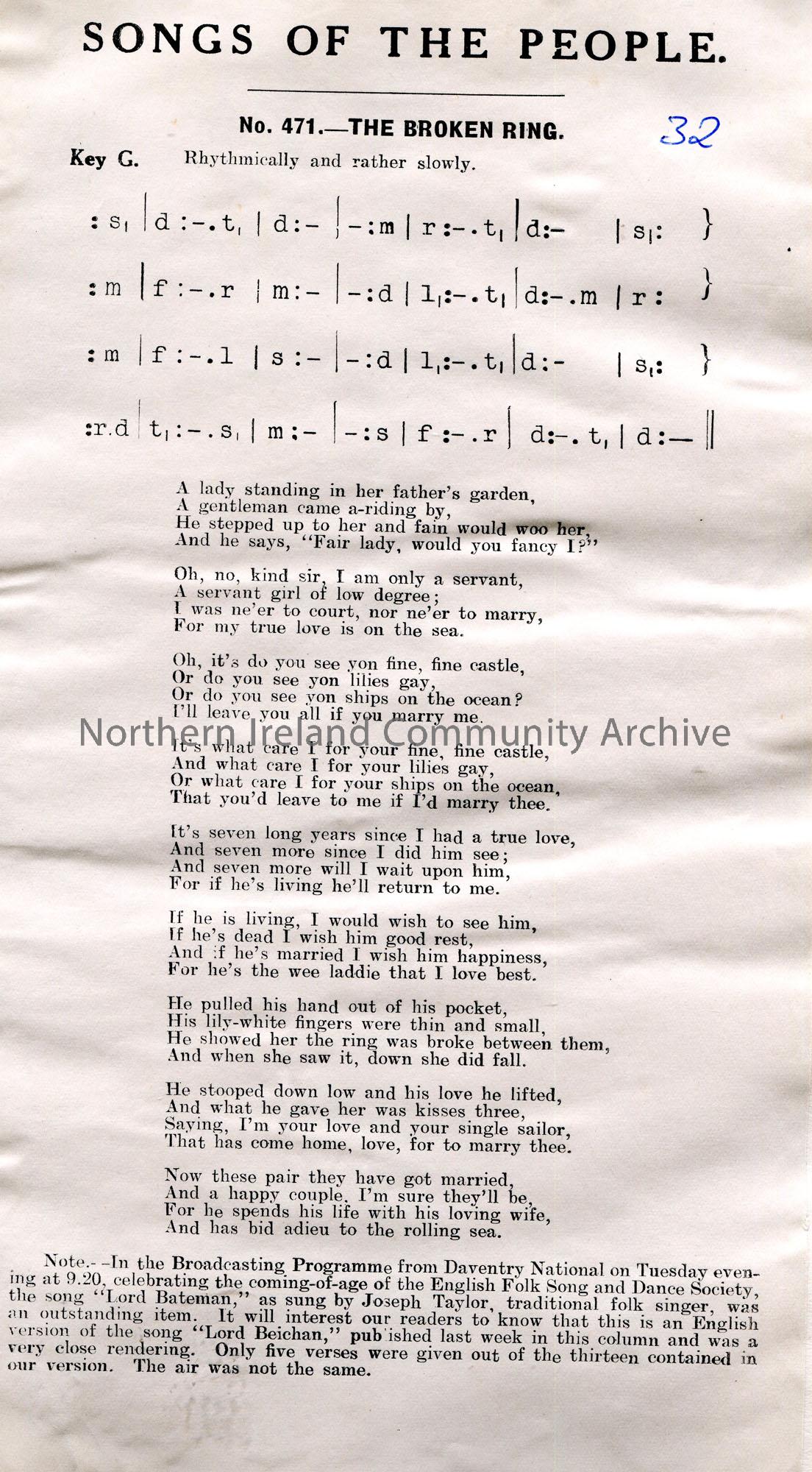 Songs of the People article of a tonic sol-fa notation and words to song titled, ‘No. 471 – The Broken Ring’.