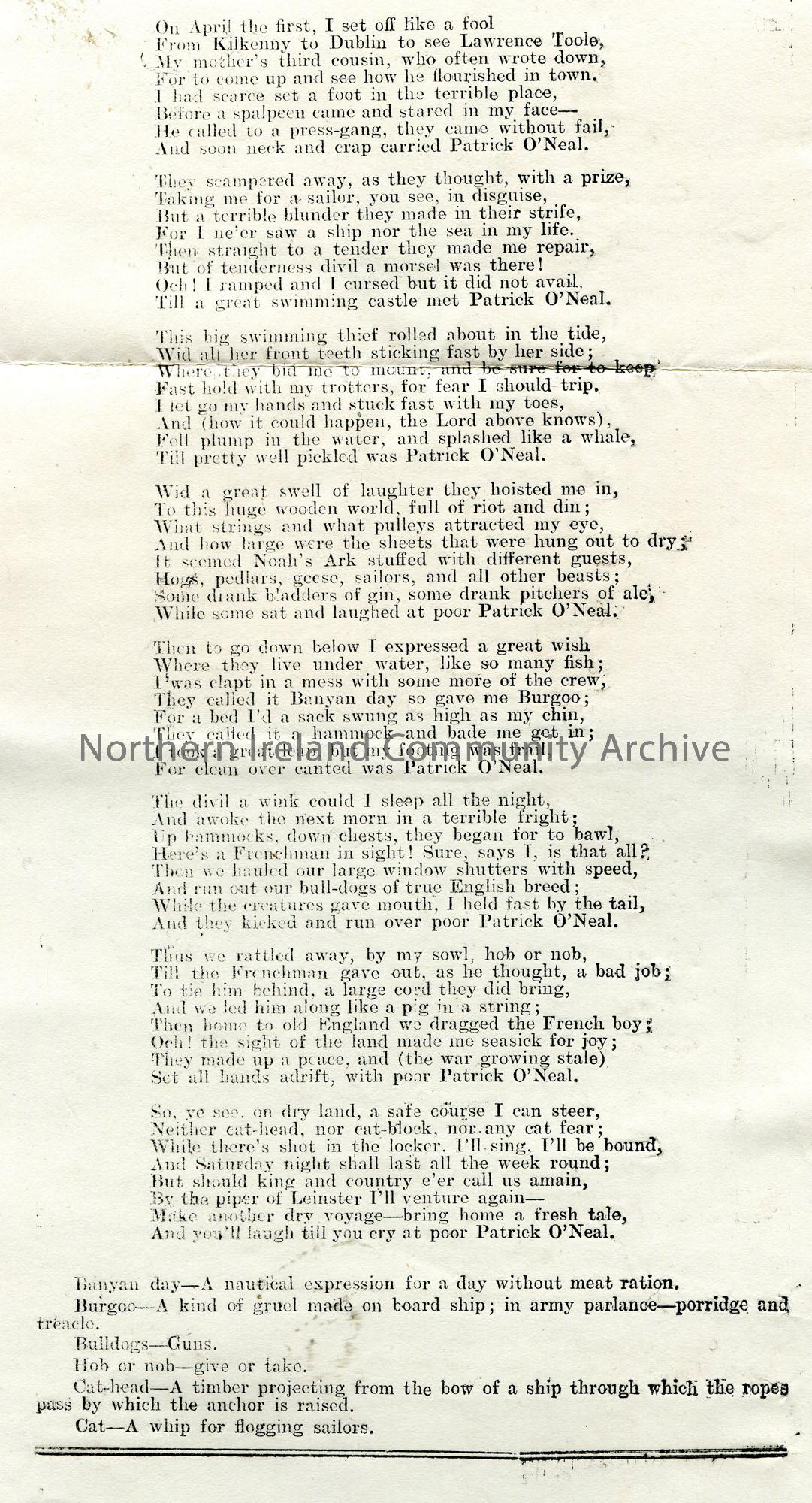 Songs of the People article of a tonic sol-fa notation and words to song titled, 'No. 552 - Patrick O'Neal'. Air taken down from the fiddling of the brothers McBride, at the Smiddy, Ballyvoy, Ballycastle. The words from the Northern Minstrel, printed and sold by Hugh Clark, Pottinger's Entry, Belfast, 1829.