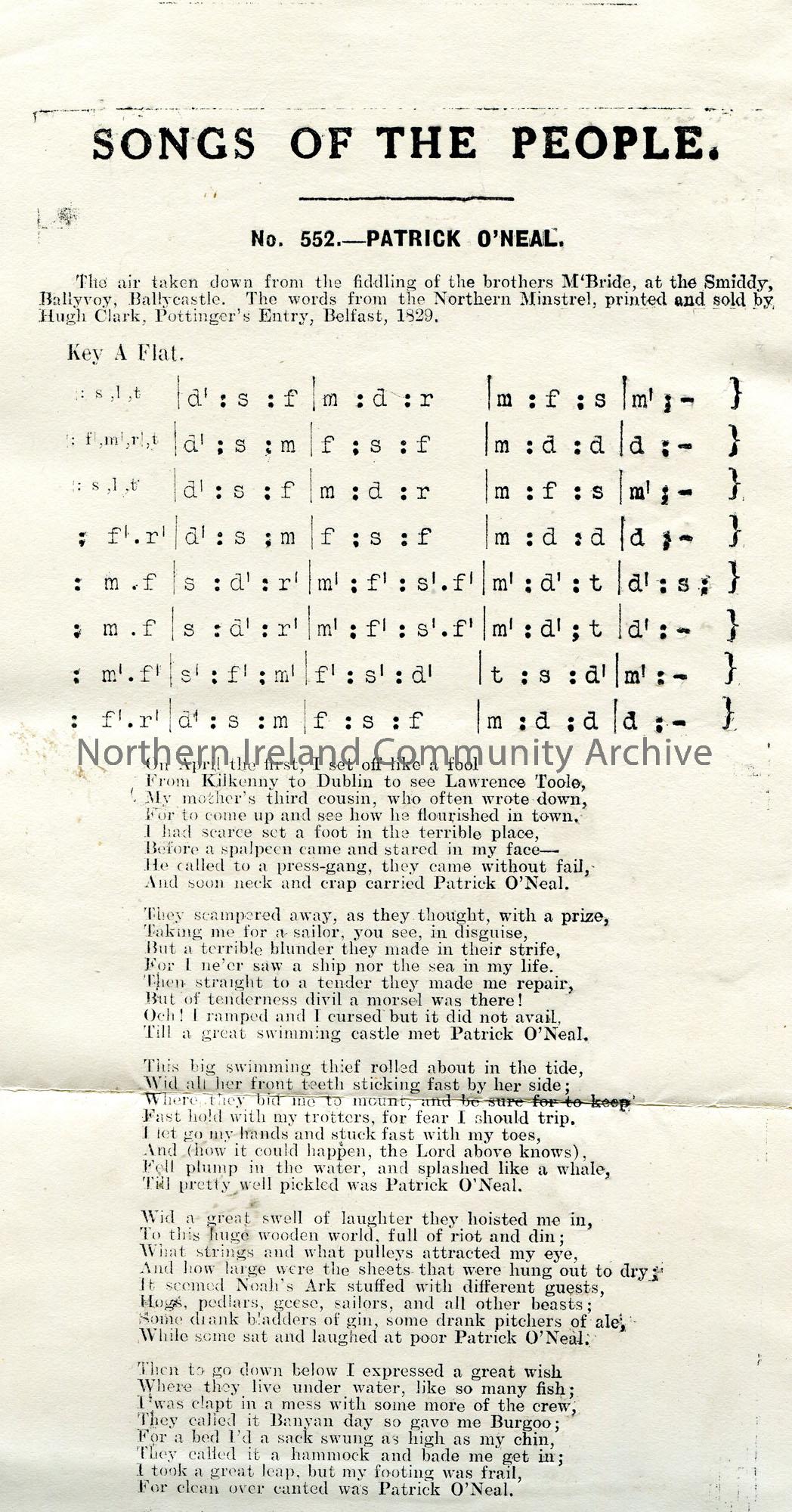 Songs of the People article of a tonic sol-fa notation and words to song titled, 'No. 552 - Patrick O'Neal'. Air taken down from the fiddling of the brothers McBride, at the Smiddy, Ballyvoy, Ballycastle. The words from the Northern Minstrel, printed and sold by Hugh Clark, Pottinger's Entry, Belfast, 1829.