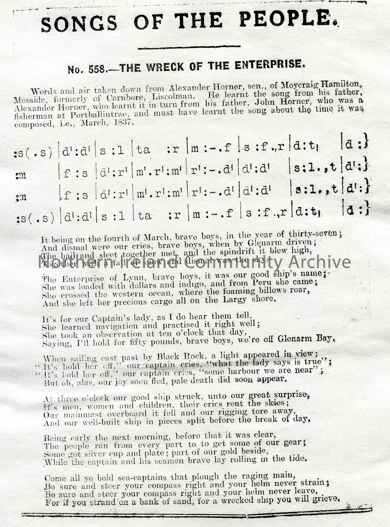 Songs of the People article of a tonic sol-fa notation and words to song titled, 'No. 558 - The Wreck of the Enterprise'. Words and air taken down from Alexander Horner, sen., of Moycraig Hamilton, Mosside, formerly of Carnbore, Liscolman. He learnt the song from his father, Alexander Horner, who learnt it from his father John Horner, who was a fisherman at Portballintrae, and must have learnt the song about the time it was composed i.e. March 1837.