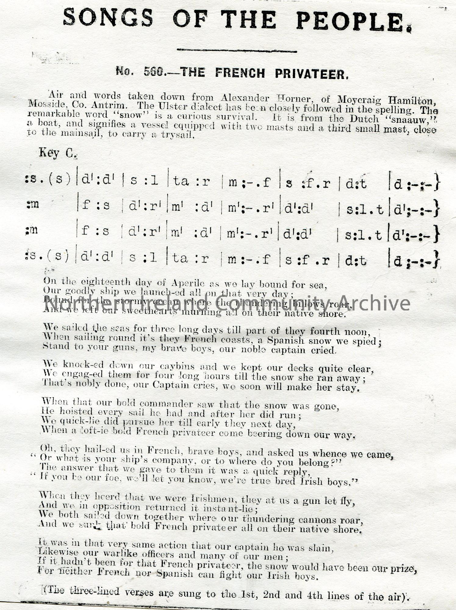Songs of the People article of a tonic sol-fa notation and words to song titled, 'No. 560 - The French Privateer'. Air and words taken down from Alexander Horner, of Moycraig Hamilton, Mosside, Co. Antrim.