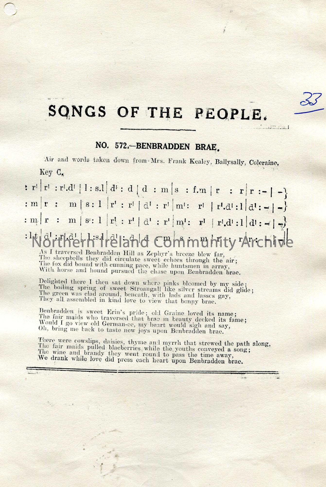 Songs of the People article of a tonic sol-fa notation and words to song titled, 'No. 572 - Benbradden Brae'. Air and words taken down from Mrs Frank Kealey, Ballysally, Coleraine.