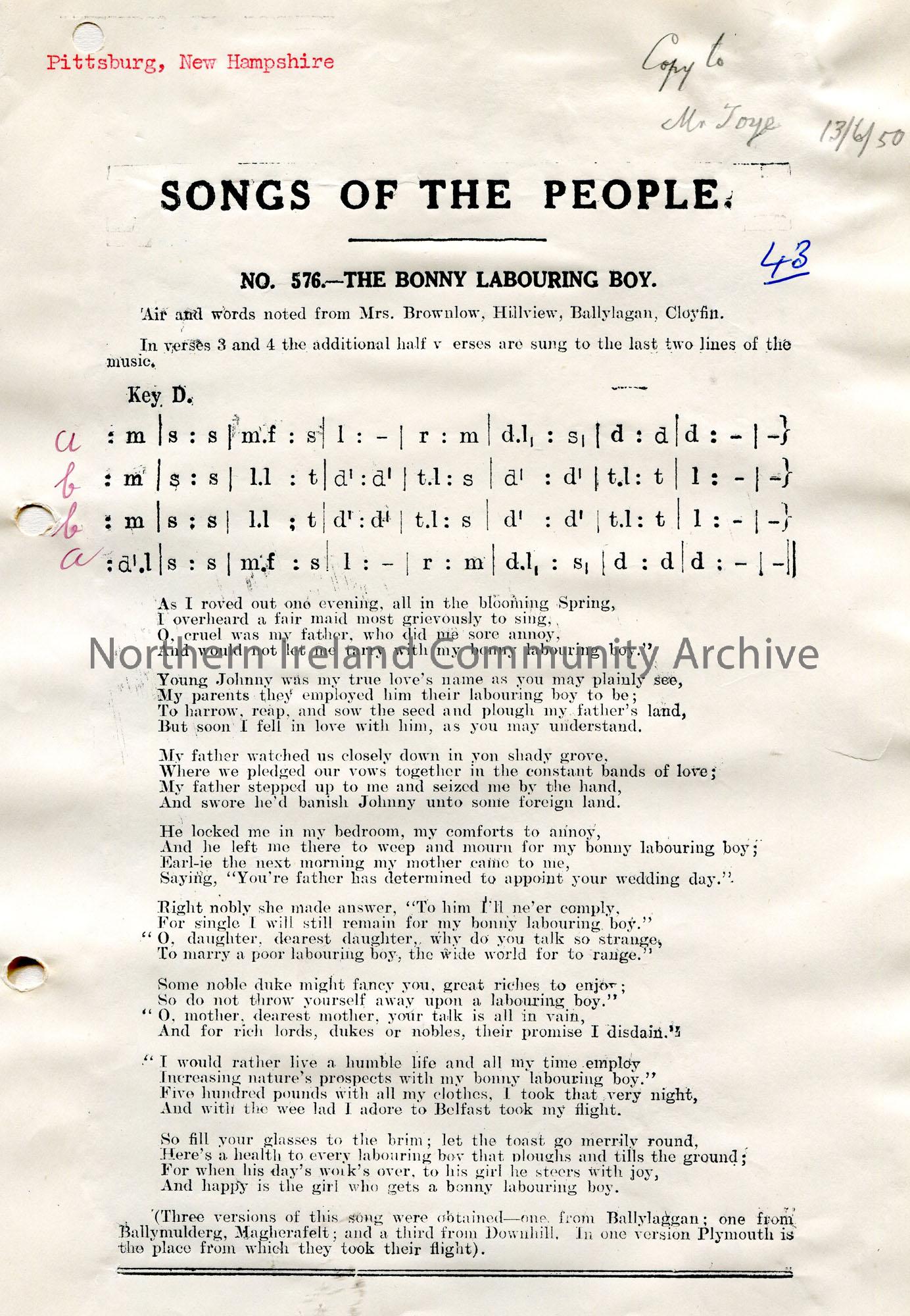 Songs of the People article of a tonic sol-fa notation and words to song titled, 'No. 576 - The Bonny Labouring Boy'. Air and words noted from Mrs Brownlow, Hillview, Ballylagan, Cloyfin. 'Copy to Mr Toye 13/6/50' handwritten in pencil top of page.