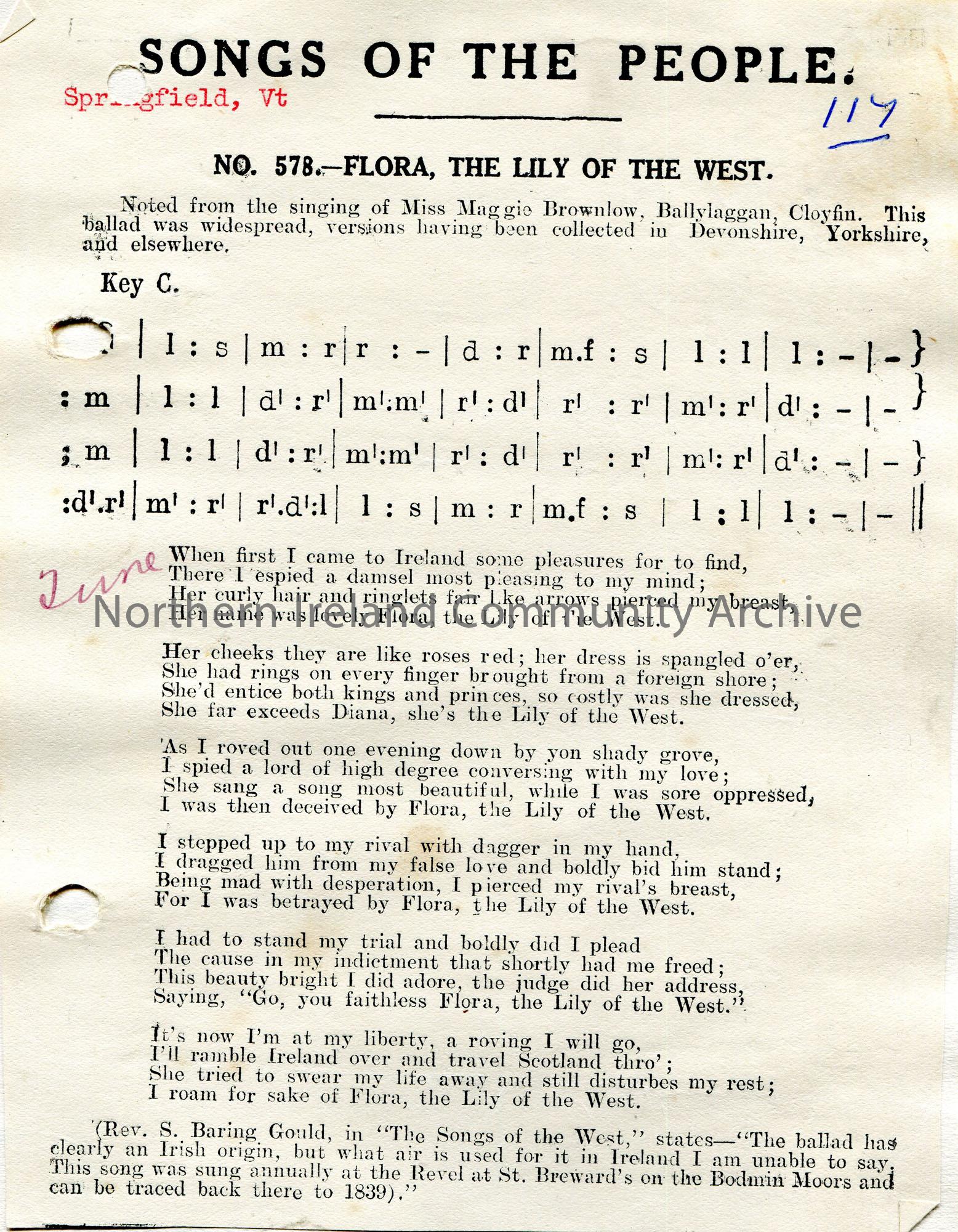 Songs of the People article of a tonic sol-fa notation and words to song titled, 'No. 578 - Flora, The Lily of the West'. Noted from the singing of Miss Maggie Brownlow, Ballylaggan, Cloyfin. This ballad was widespread, versions having been collected in Devonshire, Yorkshire, and elsewhere.
