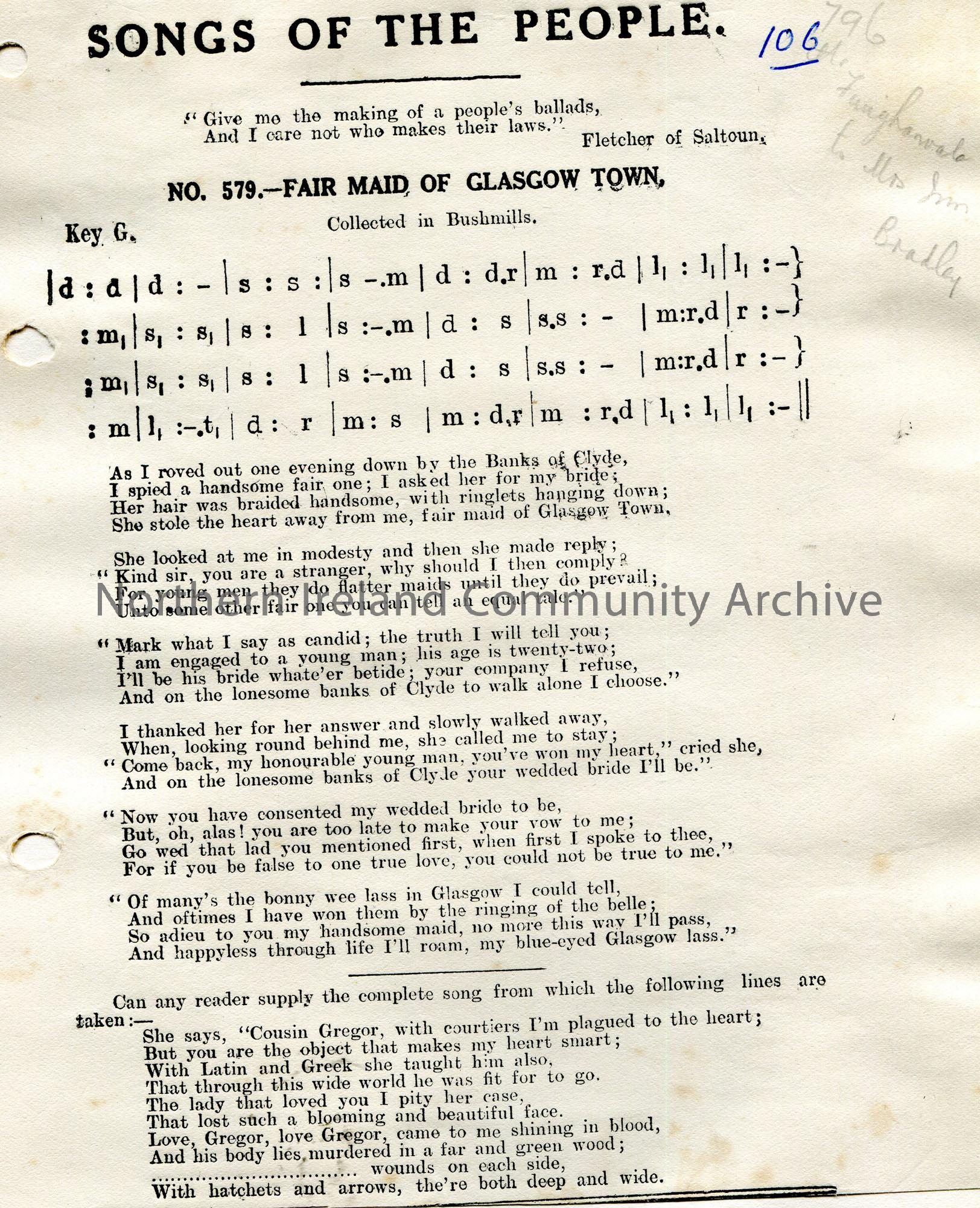 Songs of the People article of a tonic sol-fa notation and words to song titled, 'No. 579 - Fair Maid of Glasgow Town'. Collected in Bushmills. '796 [?] Faughanvale to Mrs Wm Bradley' handwritten in pencil top of page.