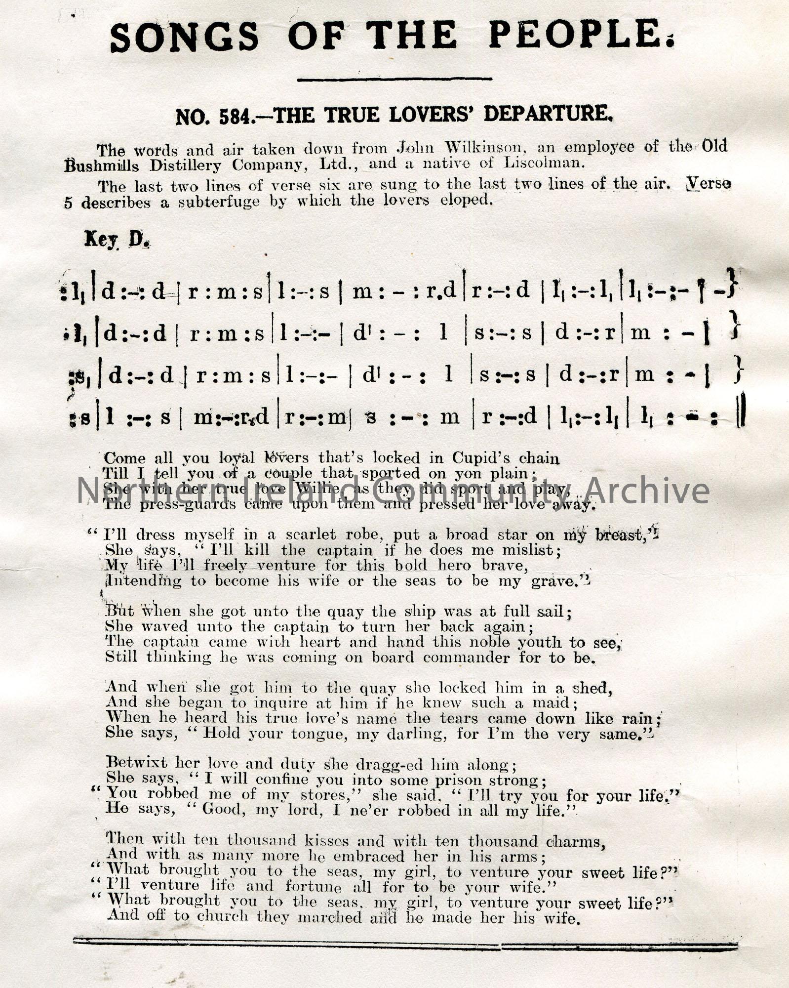 Songs of the People article of a tonic sol-fa notation and words to song titled, 'No. 584 - The True Lovers' Departure'. Words and air taken down from John Wilkinson, an employee of the Old Bushmills Distillery Company, Ltd., and a native of Liscolman.