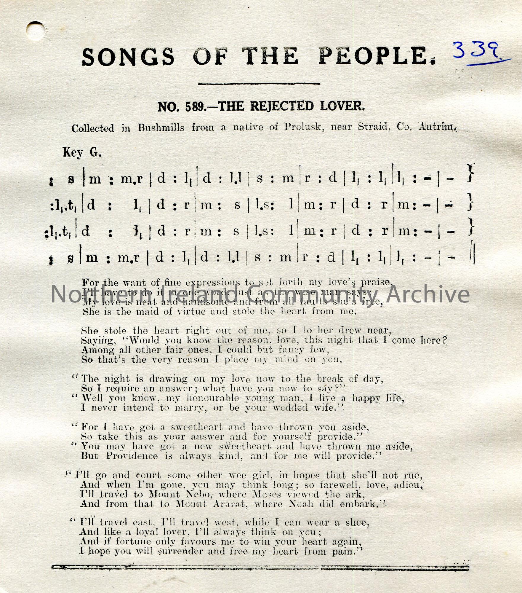 Songs of the People article of a tonic sol-fa notation and words to song titled, ‘No. 589 – The Rejected Lover’. Collected in Bushmills from a native …