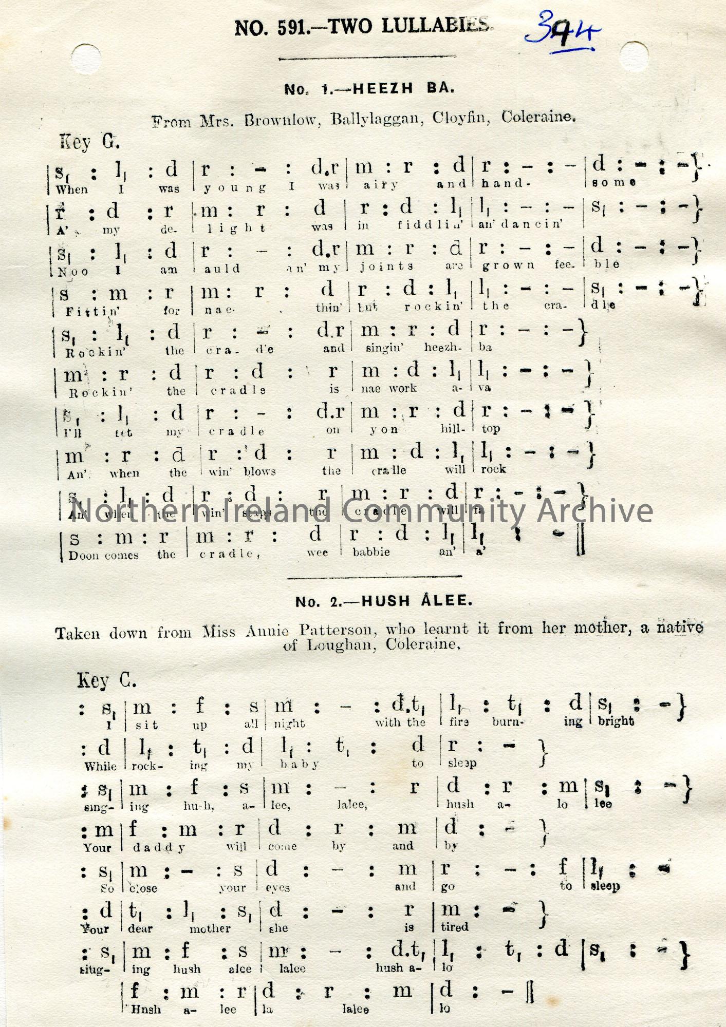 Songs of the People article of a tonic sol-fa notation and words to song titled, 'No. 591 - Two Lullabies'. No. 1 - Heezh Ba from Mrs Brownlow, Ballylaggan, Cloyfin, Coleraine. No. 2- Hush Alee taken down from Miss Annie Patterson, who learnt it from her mother, a native of Loughan, Coleraine.