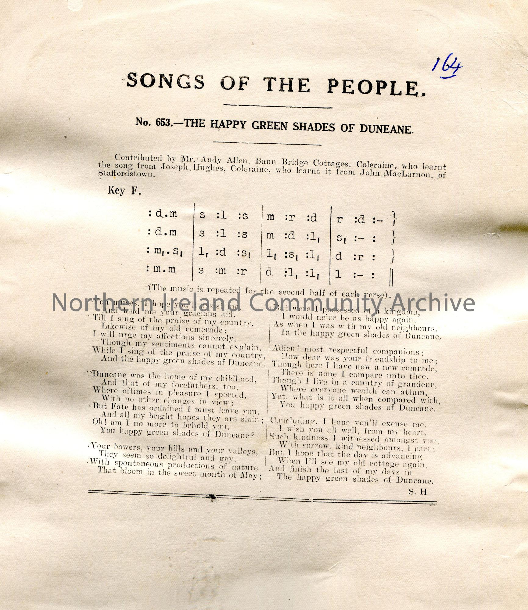 Songs of the People article of a tonic sol-fa notation and words to song titled, 'No. 653 - The Happy Green Shades of Duneane'. Contributed by Mr Andy Allen, Bann Bridge Cottages, Coleraine, who learnt the song from Joseph Hughes, Coleraine, who learnt it from John MacLarnon, of Staffordshire.