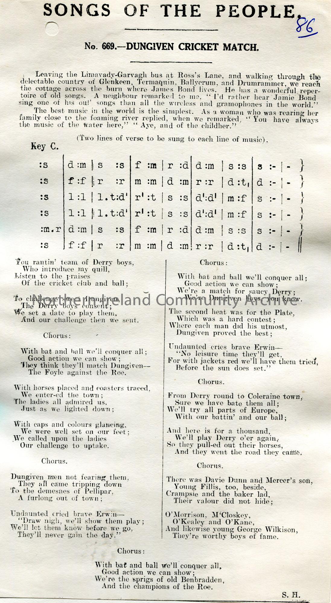 Songs of the People article of a tonic sol-fa notation and words to song titled, ‘No. 669 – Dungiven Cricket Match’.