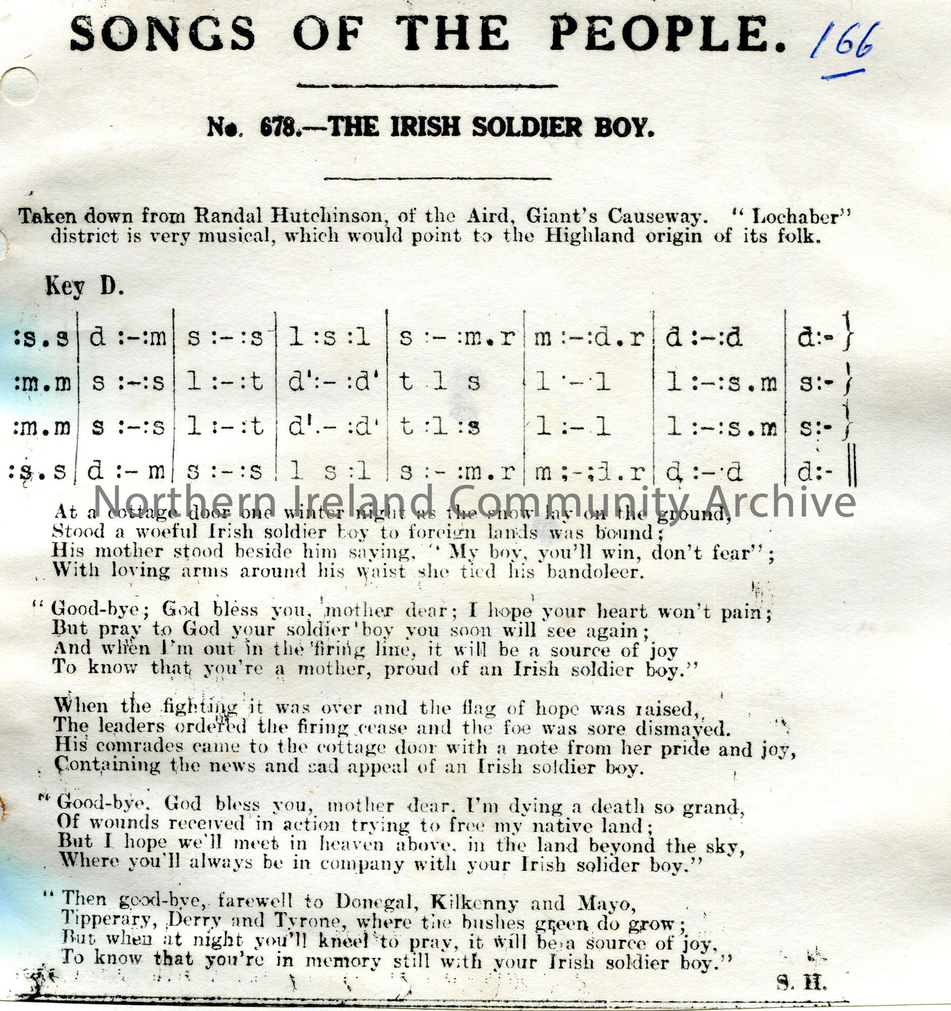 Songs of the People article of a tonic sol-fa notation and words to song titled, 'No. 678 - The Irish Soldier Boy'. Taken down from Randal Hutchinson, of the Aird, Giant's Causeway. "Lochaber" district is very musical, which would point to the Highland origin of its folk.