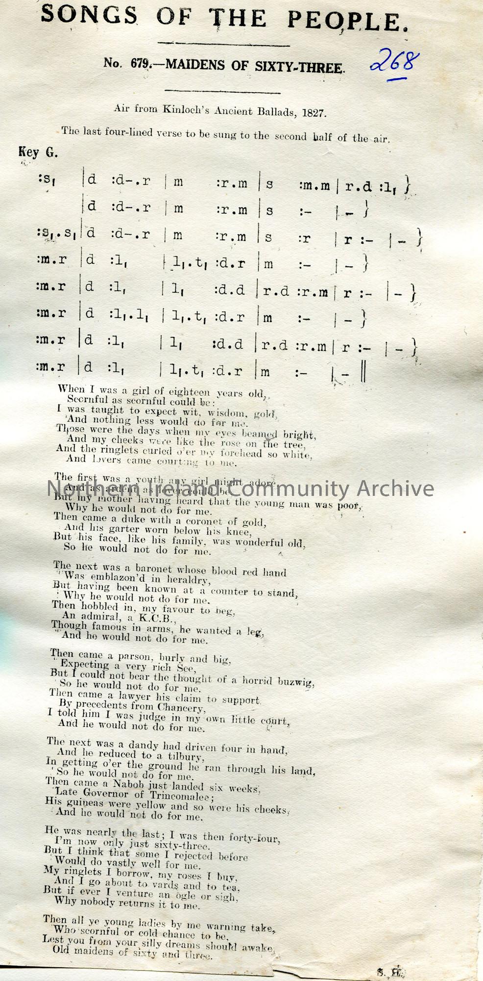 Songs of the People article of a tonic sol-fa notation and words to song titled, ‘No. 679 – Maidens of Sixty-Three’. Air from Kinloch’s Ancient Ballad…