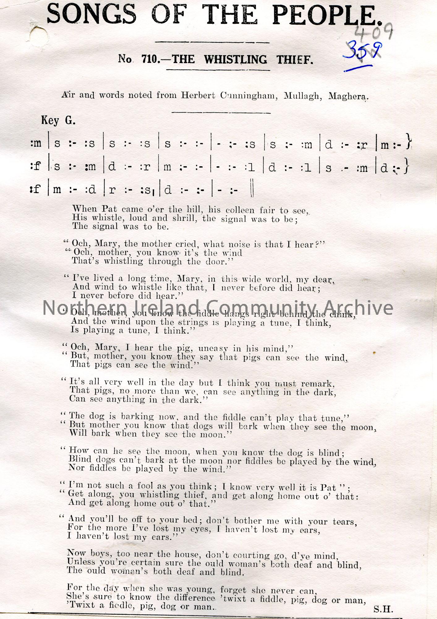 Songs of the People article of a tonic sol-fa notation and words to song titled, 'No. 710 - The Whistling Thief'. Air and words noted from Herbert Canningham, Mullagh, Maghera.