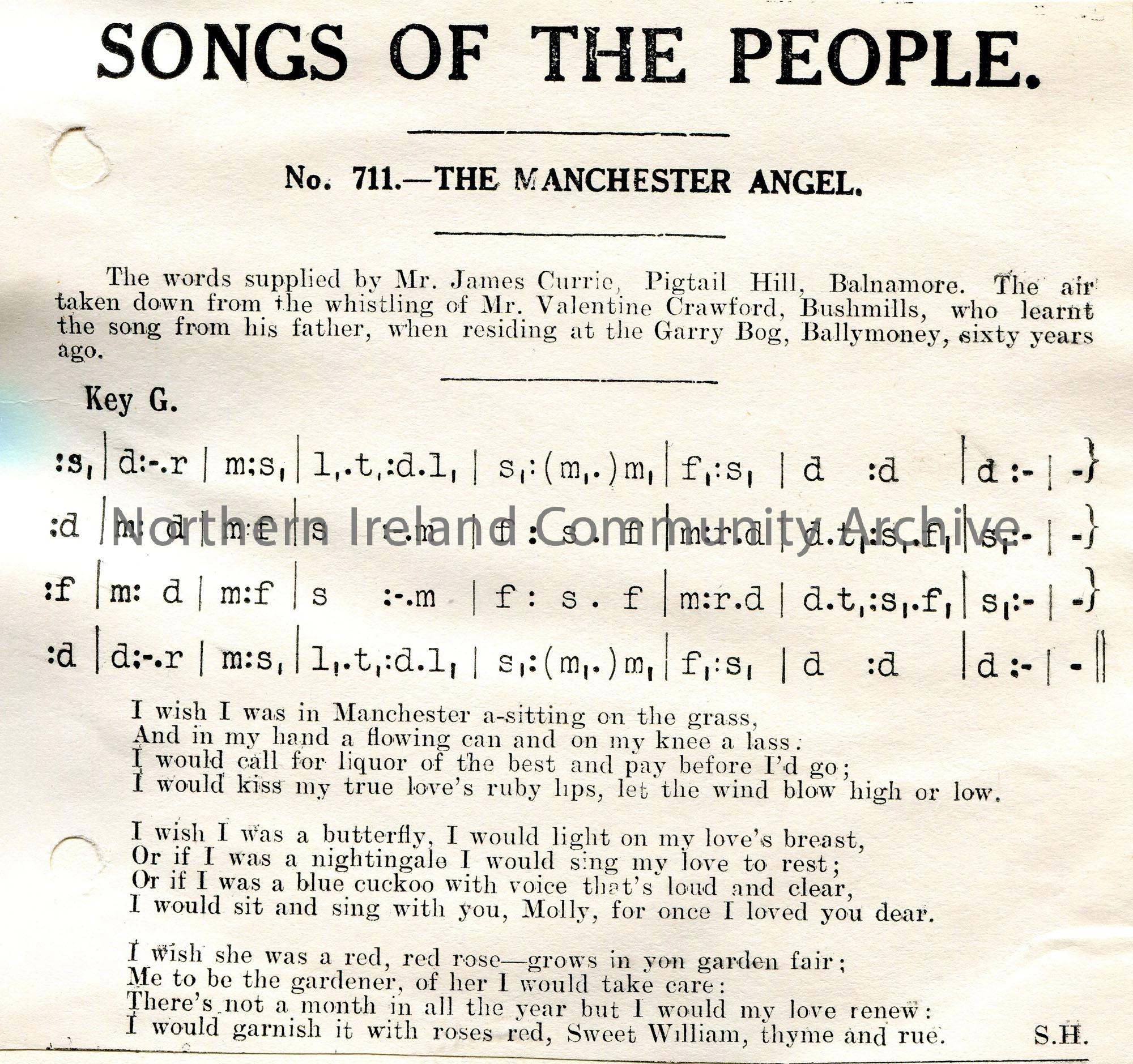 Songs of the People article of a tonic sol-fa notation and words to song titled, 'No. 711 - The Manchester Angel'. Words supplied by Mr James Currie, Pigtail Hill, Balnamore. Air taken down from the whistling of Mr Valentine Crawford, Bushmills, who learnt the song from his father when residing at the Garry Bog, Ballymoney.