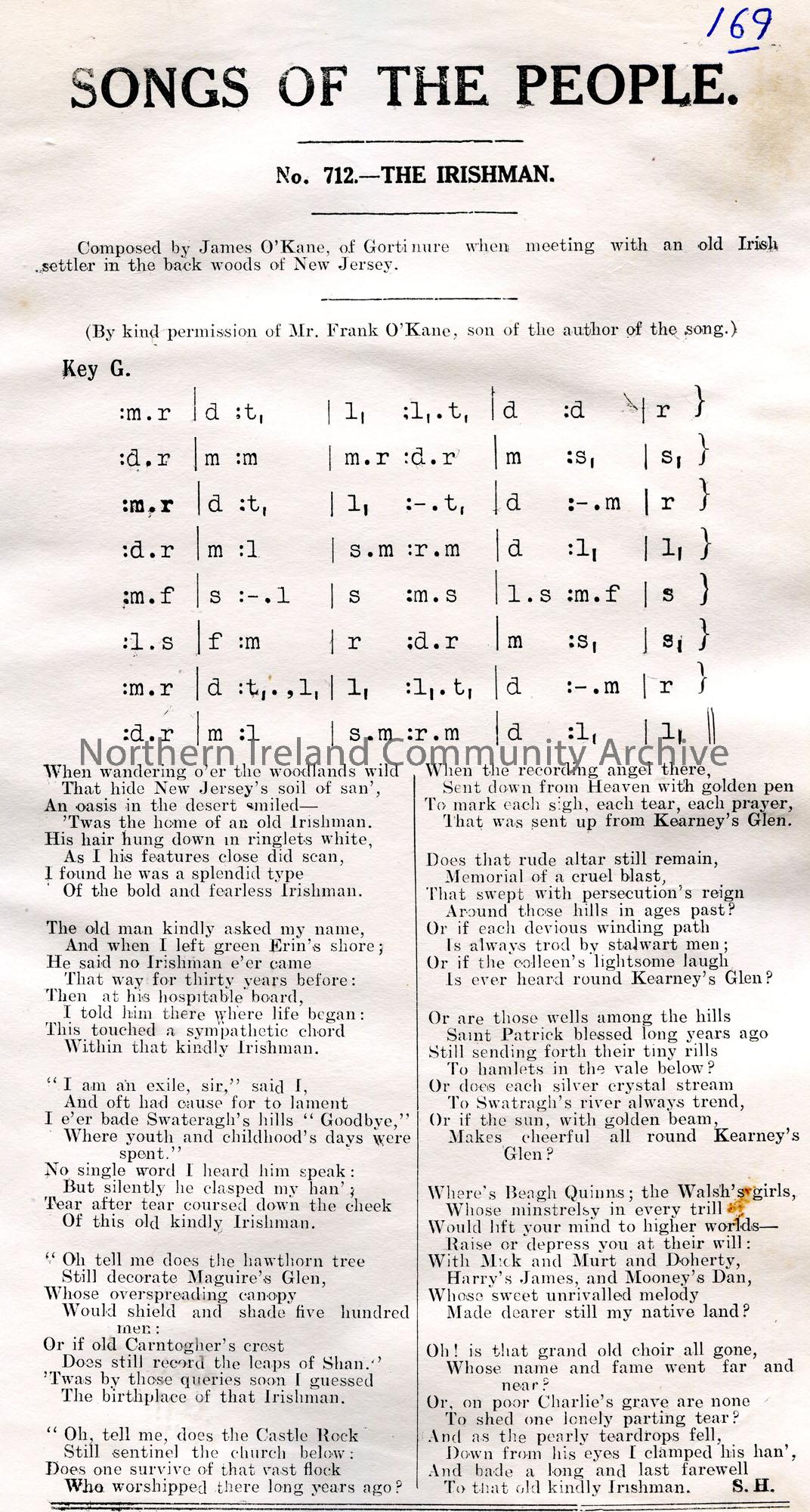 Songs of the People article of a tonic sol-fa notation and words to song titled, 'No. 712 - The Irishman'. Composed by James O'Kane of Gortinure when meeting with an old Irish settler in the back woods of New Jersey. Mentions Swatragh, Carntogher, Kearney's Glen, Castle Rock