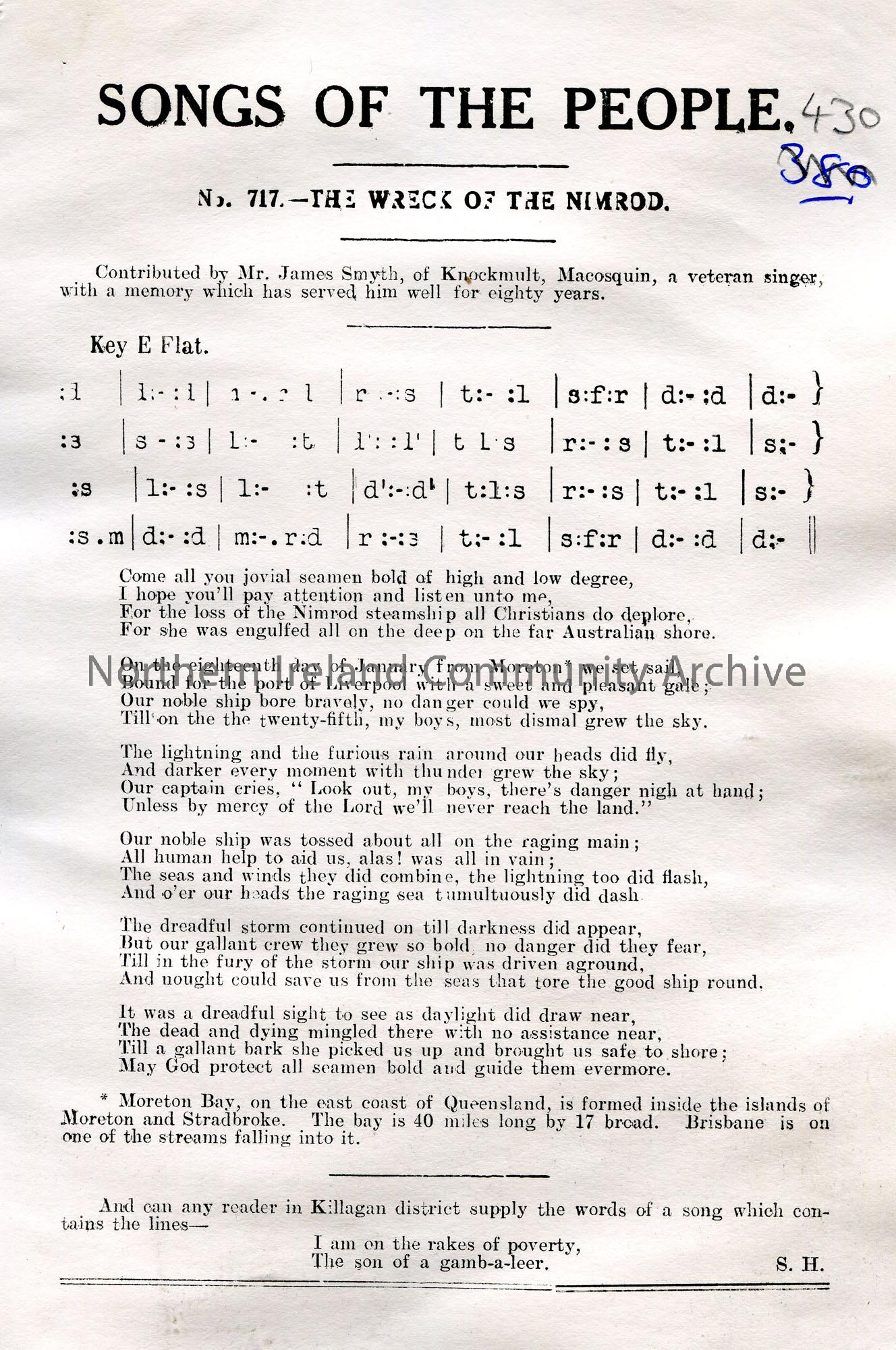 Songs of the People article of a tonic sol-fa notation and words to song titled, 'No. 717 - The Wreck of the Nimrod'. Contributed by Mr James Smyth, Knockmult, Macosquin, a veteran singer...