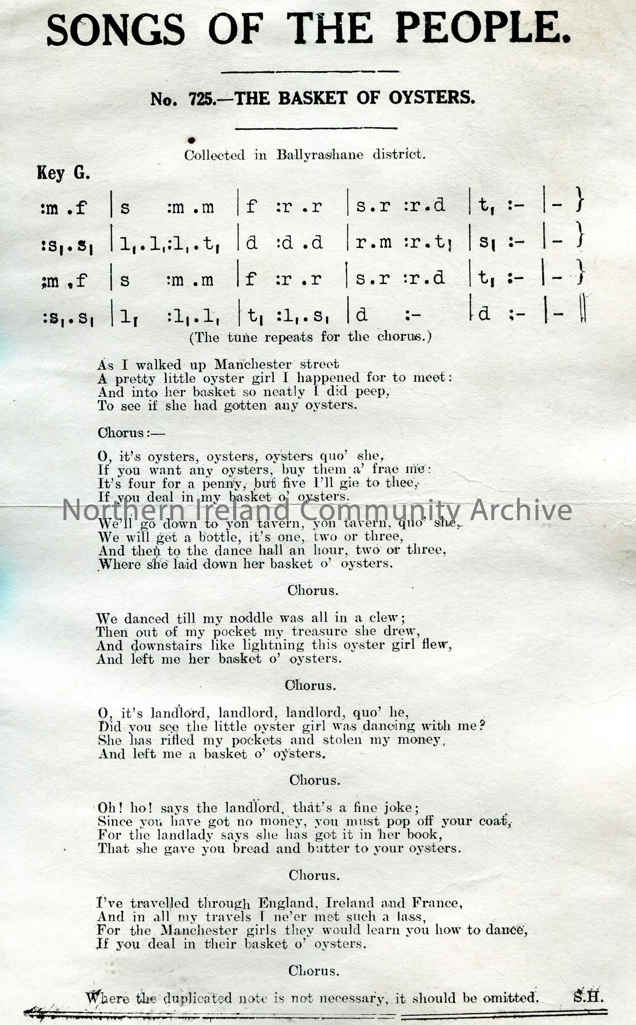 Songs of the People article of a tonic sol-fa notation and words to song titled, ‘No. 725 – The Basket of Oysters’. Collected in Ballyrashane district…