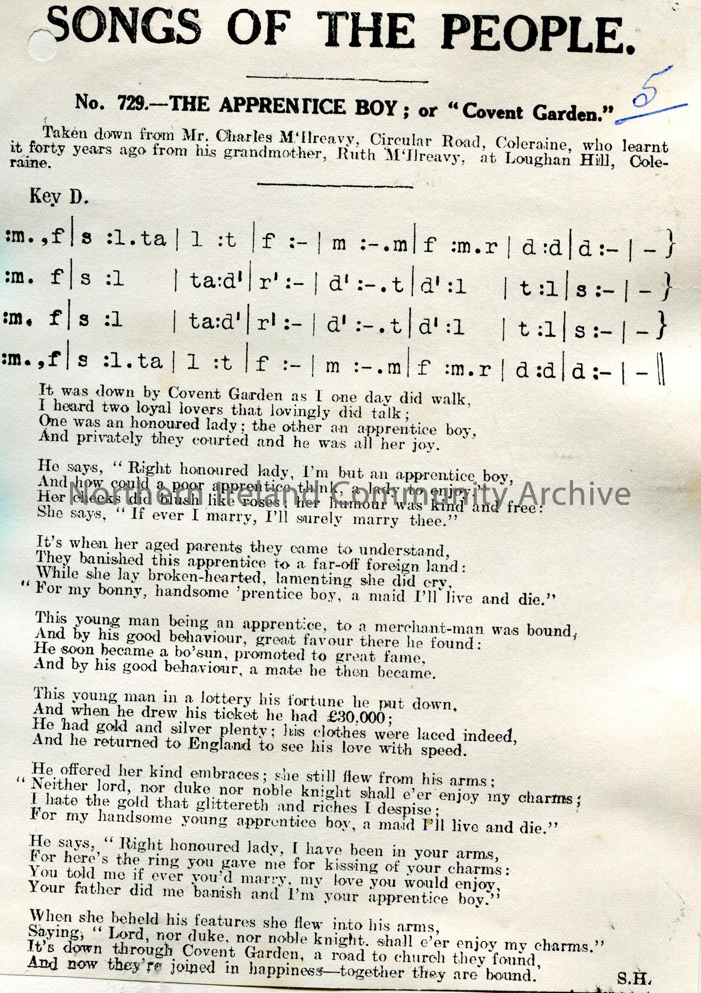 Songs of the People article of a tonic sol-fa notation and words to song titled, 'No. 729 - The Apprentice Boy ; or "Covent Garden." Taken down from Mr Charles M'Ilreavy, Circular Road, Coleraine, who learnt it from his grandmother, Ruth M'Ilreavy, at Loughan Hill, Coleraine.