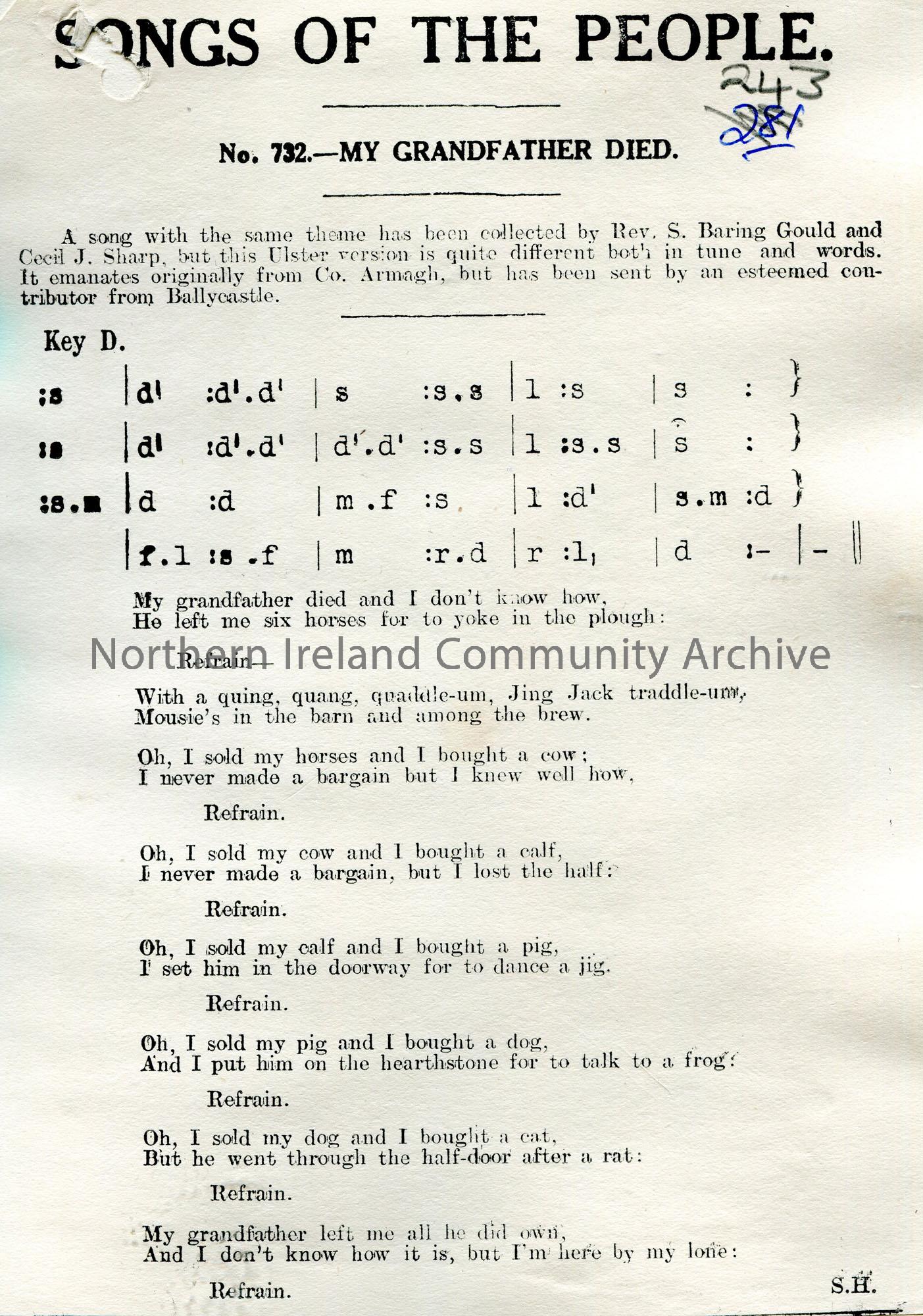 Songs of the People article of a tonic sol-fa notation and words to song titled, 'No. 732 - My Grandfather Died'. Sent by an 'esteemed contributor from Ballycastle'.