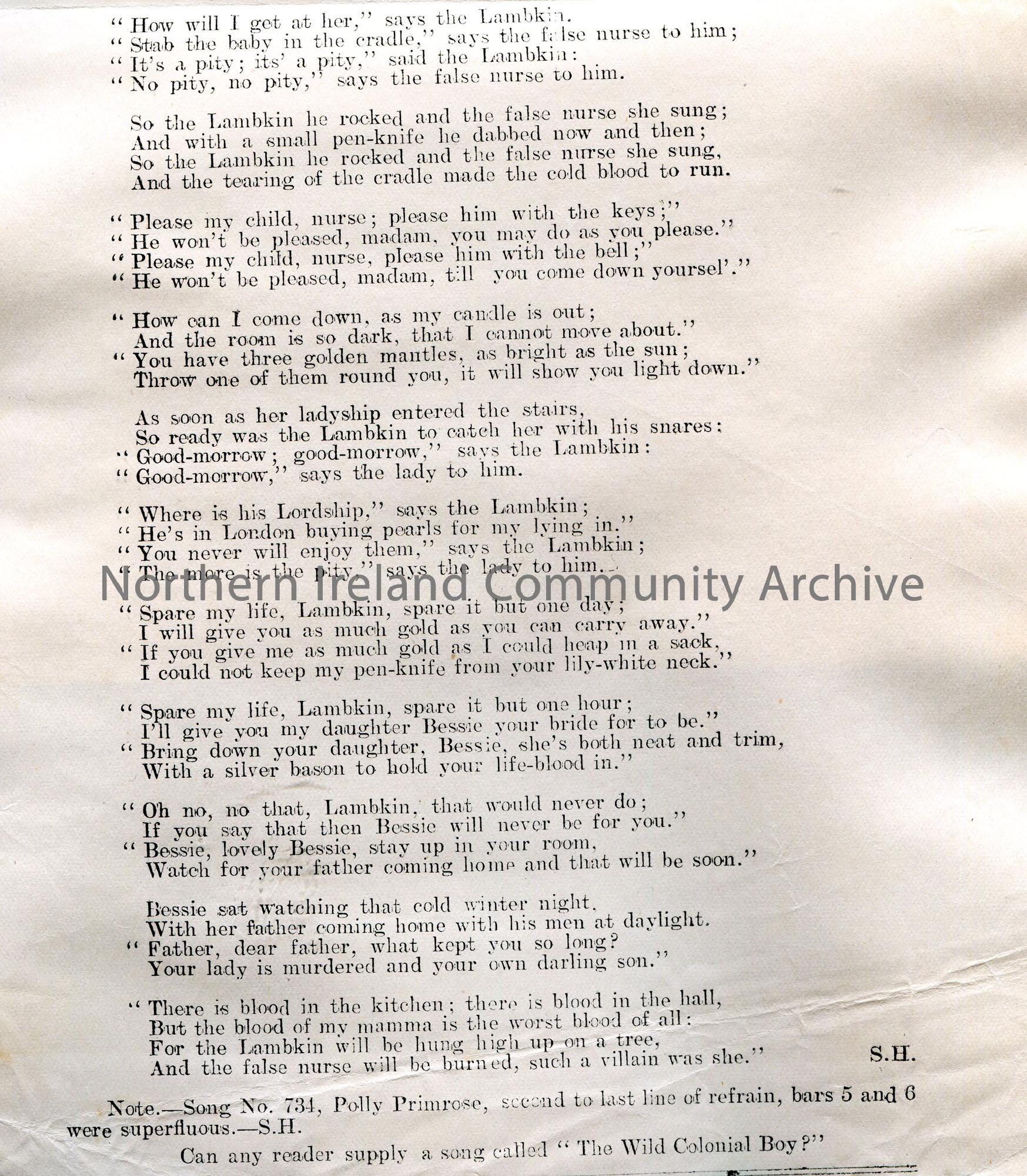 Songs of the People article of a tonic sol-fa notation and words to song titled, 'No. 735 - Lambkin'. Noted from Mr Alexander Crawford, Leck, Ballymoney, who learnt it...when a boy at the Garry Bog, from an old travelling woman...