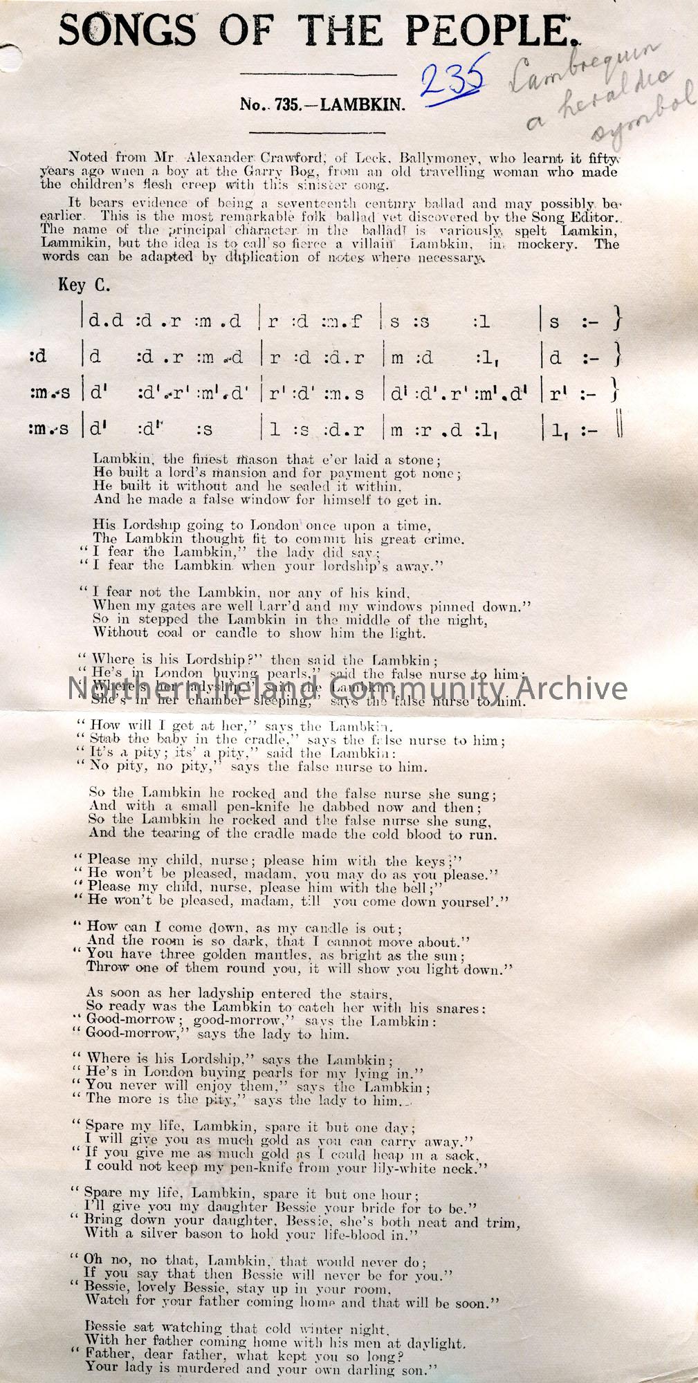 Songs of the People article of a tonic sol-fa notation and words to song titled, 'No. 735 - Lambkin'. Noted from Mr Alexander Crawford, Leck, Ballymoney, who learnt it...when a boy at the Garry Bog, from an old travelling woman...