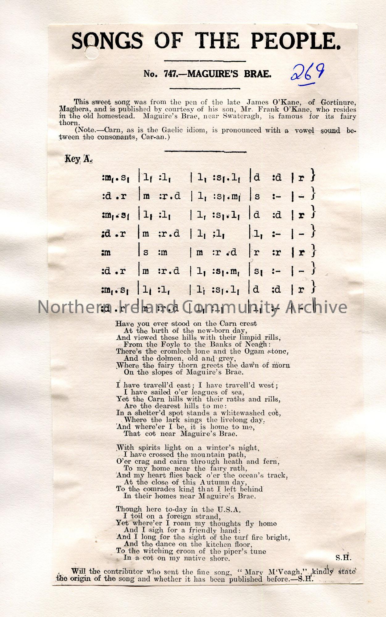 Songs of the People article of a tonic sol-fa notation and words to song titled, 'No. 747 - Maguire's Brae'. 'From the pen of James O'Kane, of Gortinure, Maghera, and is published by courtesy of his son, Mr Frank O'Kane... Maguire's Brae, near Swateragh, is famous for its fairy thorn'.