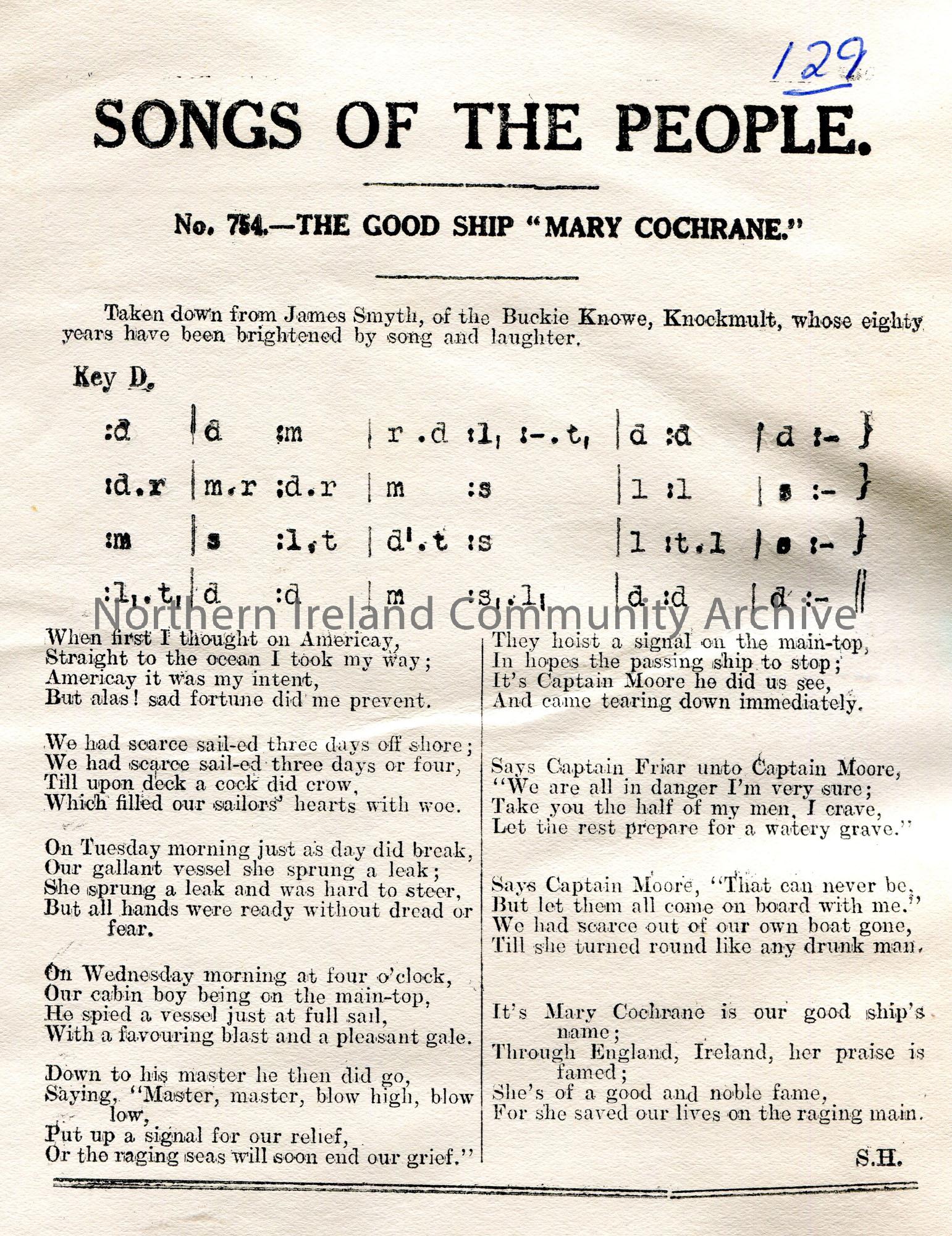Songs of the People article of a tonic sol-fa notation and words to song titled, ‘No. 754 – The Good Ship “Mary Cochrane.” Taken down from James Smyth…