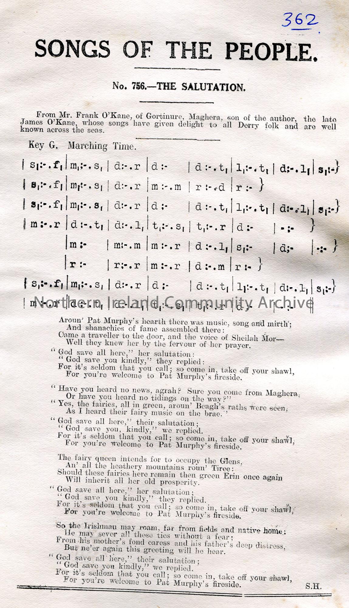 Songs of the People article of a tonic sol-fa notation and words to song titled, 'No. 756 - The Salutation'. 'From Mr Frank O'Kane, of Gortinure, Maghera, son of the author, the late James O'Kane, whose songs have given delight to all Derry folk and are well known across the seas'. Song refers to Pat Murphy.