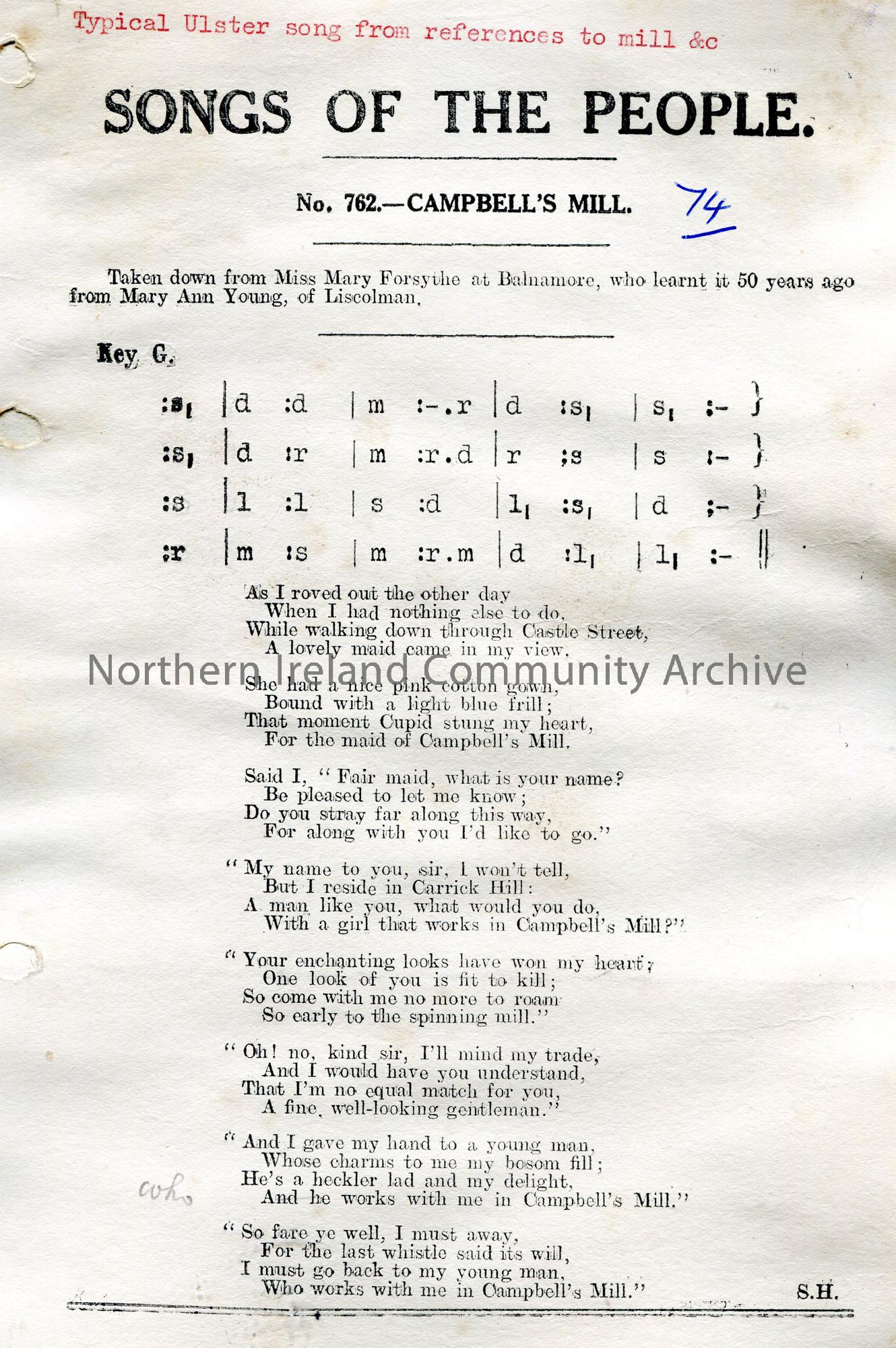 Songs of the People article of a tonic sol-fa notation and words to song titled, 'No. 762 - Campbell's Mill'. Taken down from Miss Mary Forsythe at Balnamore, who learnt it...from Mary Ann Young, of Liscolman.