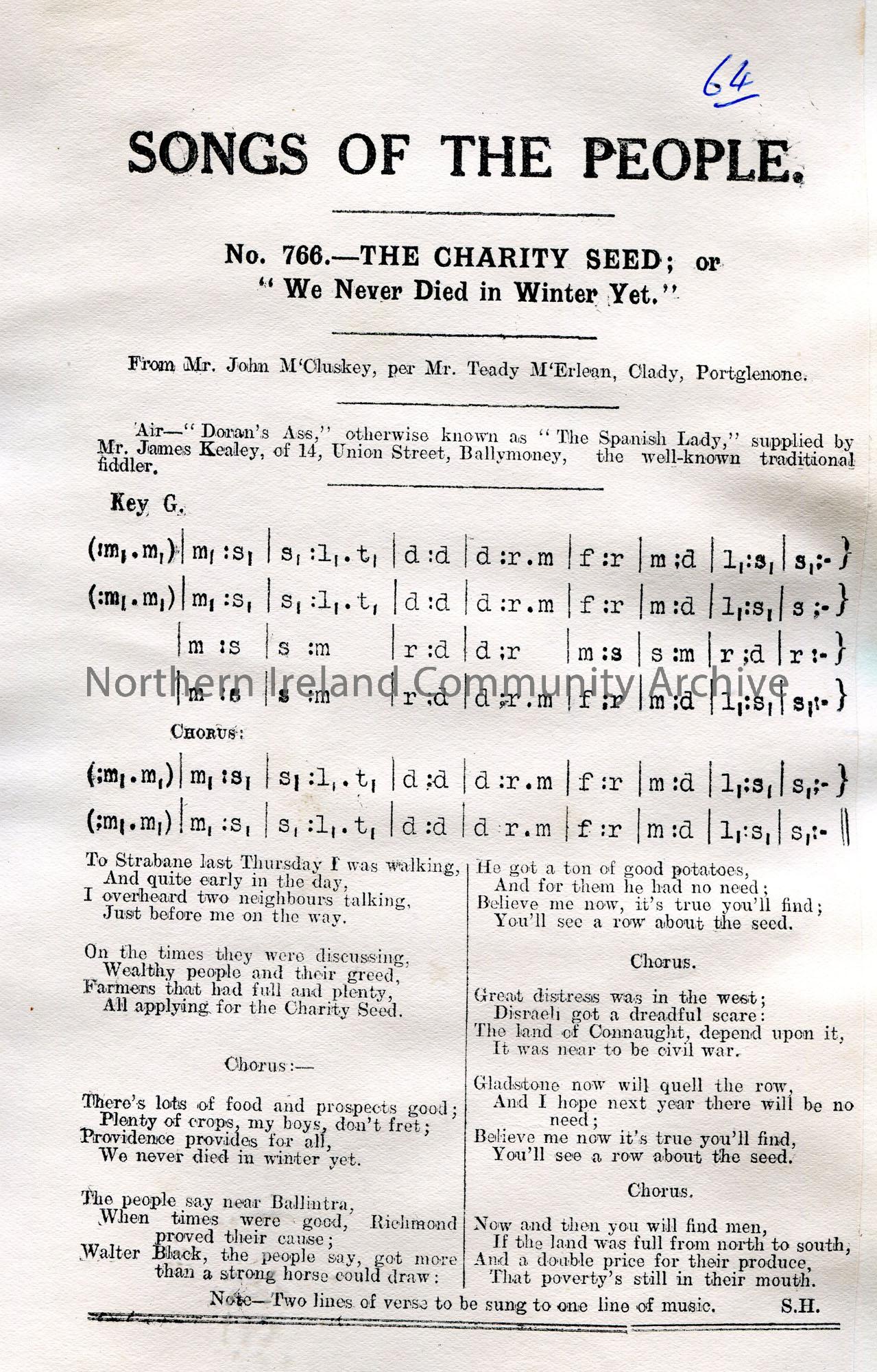 Songs of the People article of a tonic sol-fa notation and words to song titled, 'No. 766 - The Charity Seed ; or "We Never Died in Winter Yet." From Mr John McCluskey, per Mr Teady McErlean, Clady, Portglenone.