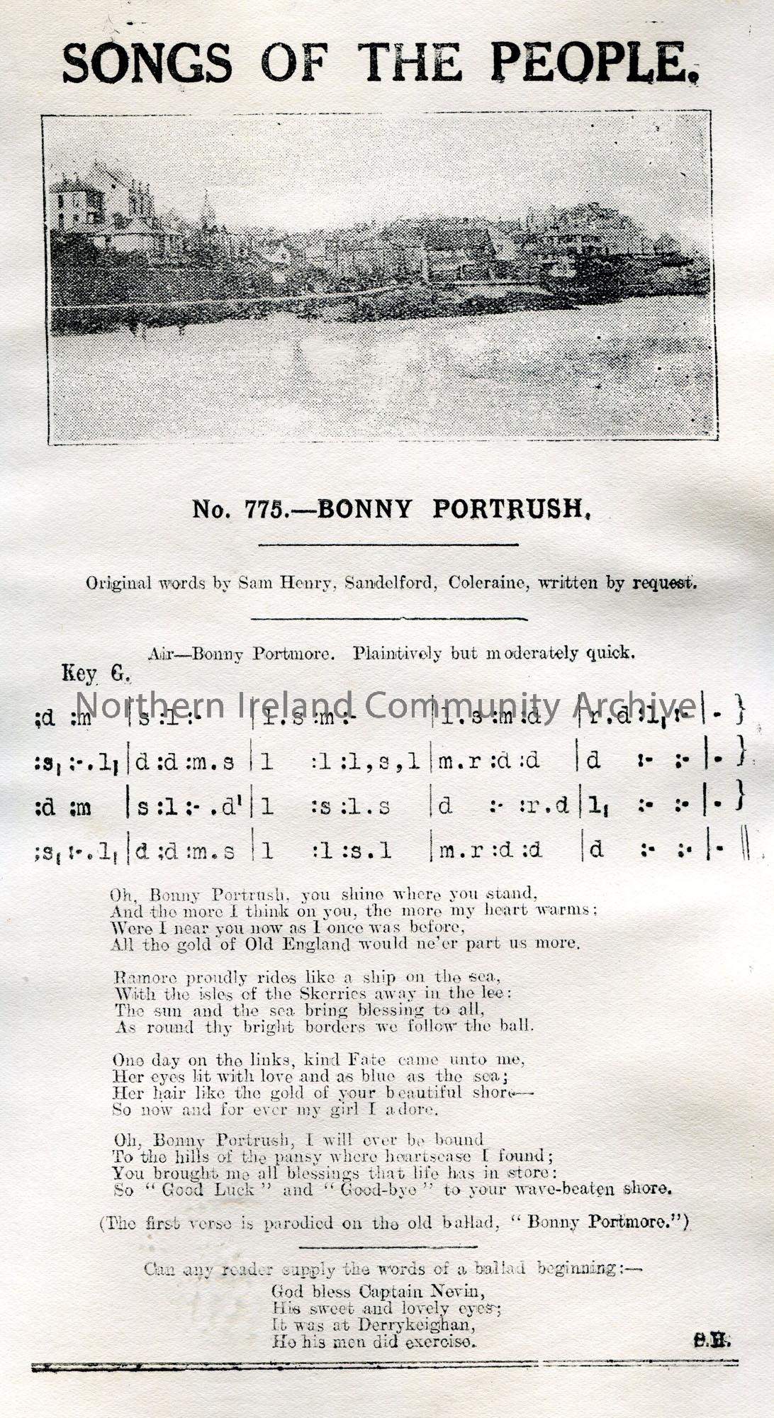 Songs of the People article of a tonic sol-fa notation and words to song titled, 'No. 775 - Bonny Portrush'. Features photographic image of Portrush. Original words by Sam Henry, Sandelford, Coleraine, written by request.