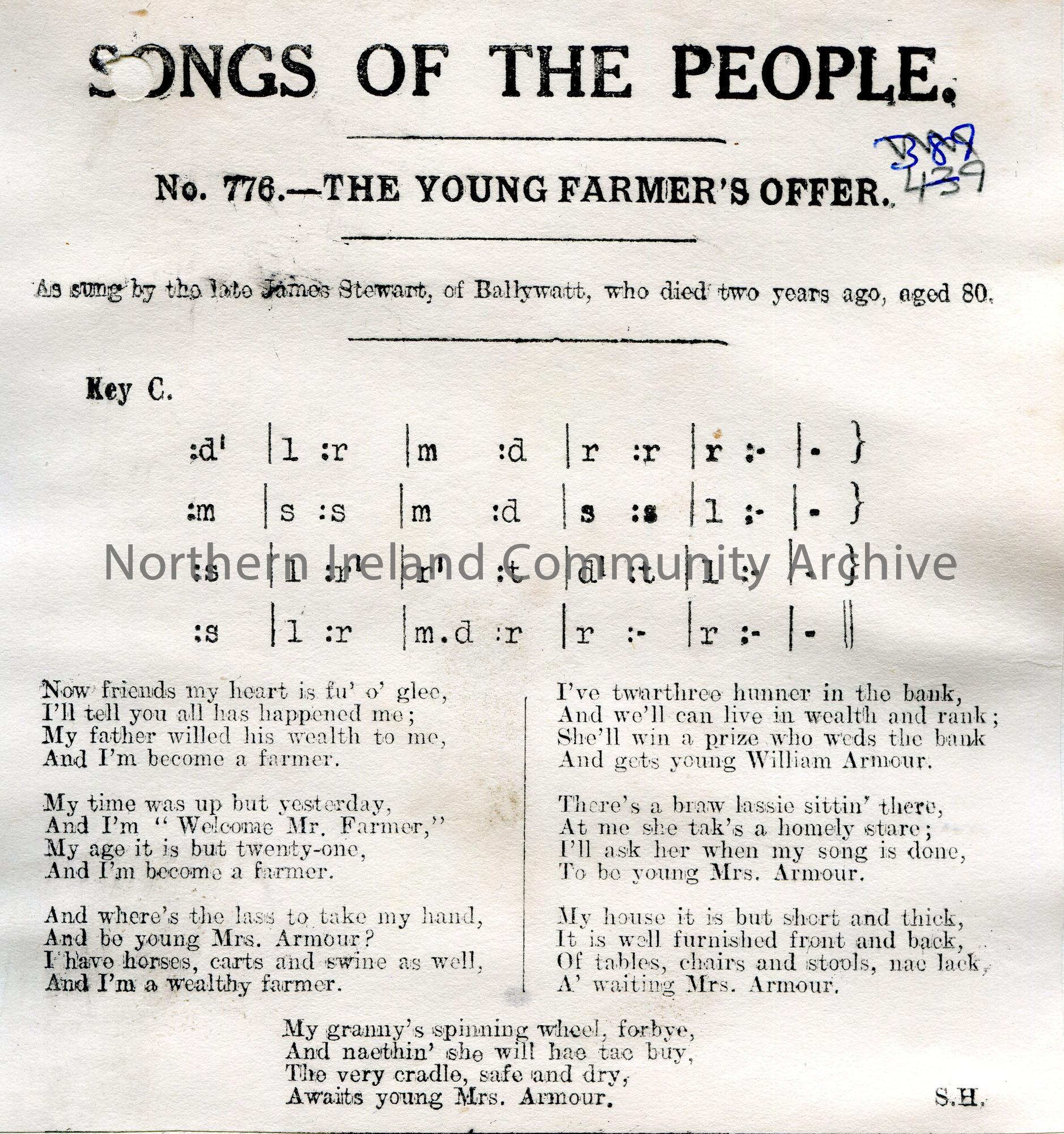 Songs of the People article of a tonic sol-fa notation and words to song titled, 'No. 776 - The Young Farmer's Offer'. As sung by the late James Stewart of Ballywatt.