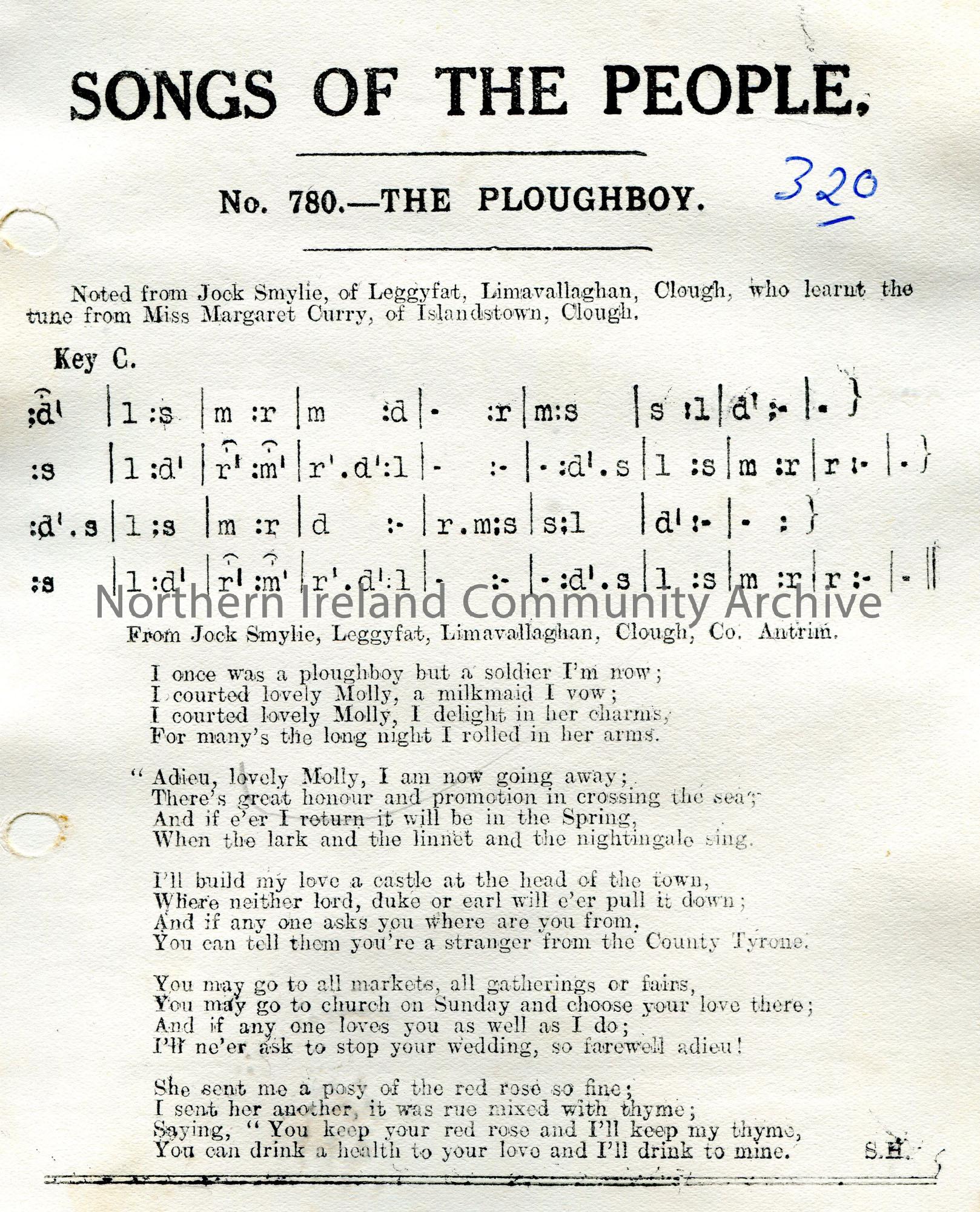 Songs of the People article of a tonic sol-fa notation and words to song titled, 'No. 780 - The Ploughboy'. Noted from Jock Smylie, of Leggyfat, Limavallaghan, Clough, who learnt the tune from Miss Margaret Curry, of Islandstown, Clough.