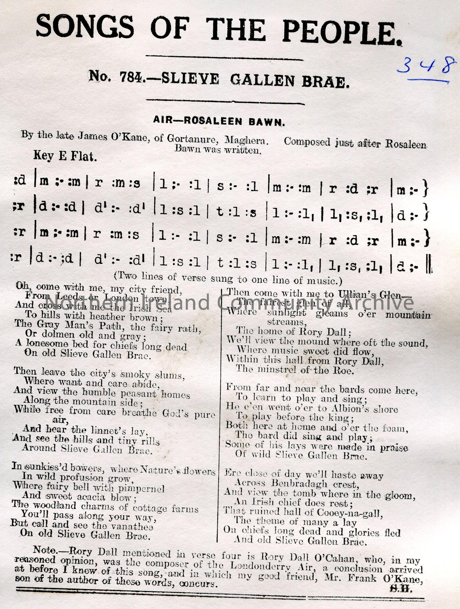 Songs of the People article of a tonic sol-fa notation and words to song titled, ‘No. 784 – Slieve Gallen Brae’. By James O’Kane, of Gortanure, Magher…