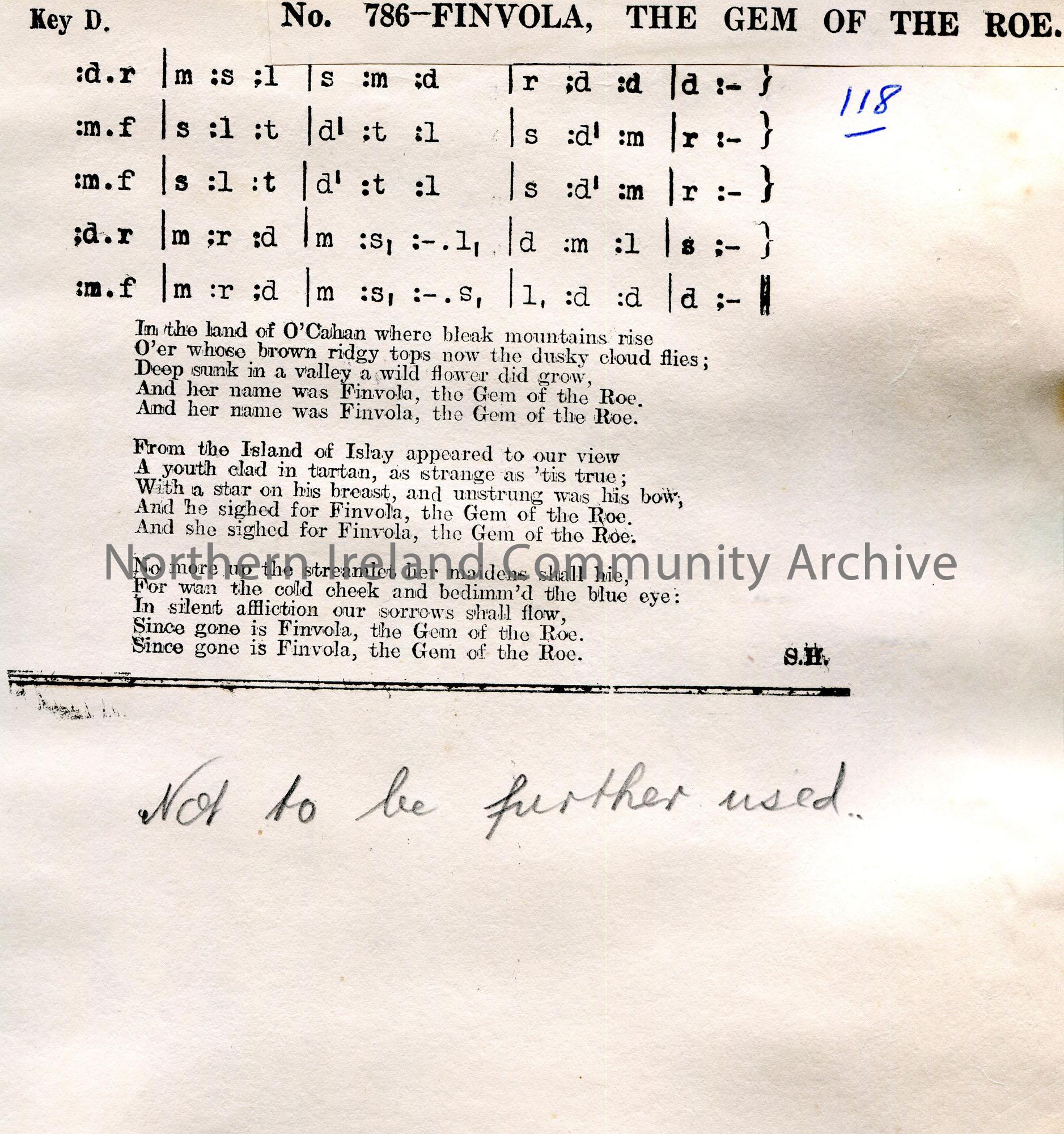 Songs of the People article of a tonic sol-fa notation and words to song titled, 'No. 786 - Finvola, The Gem of the Roe'. 'Not to be further used' handwritten in pencil below song.