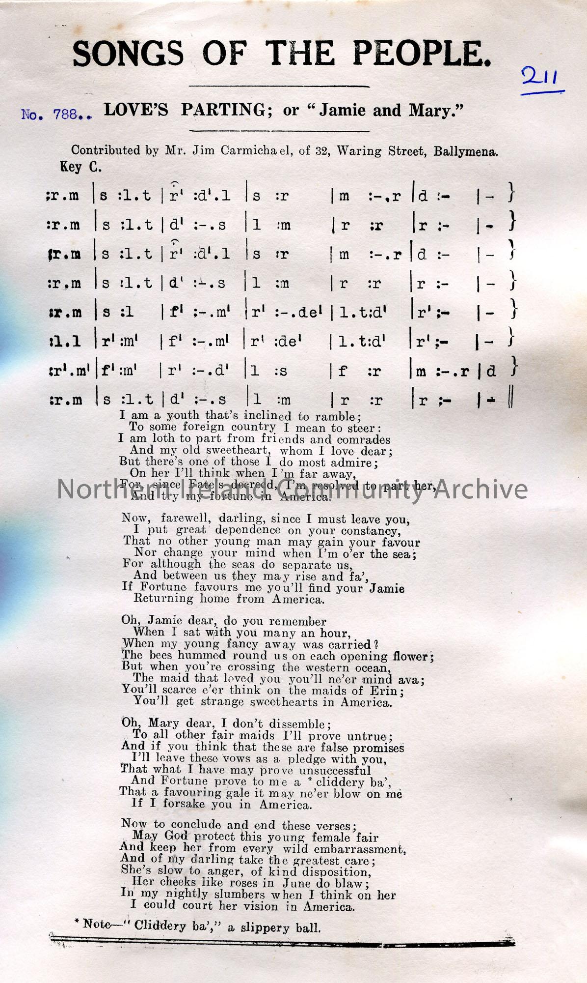 Songs of the People article of a tonic sol-fa notation and words to song titled, 'No. 788 - Love's Parting ; or "Jamie and Mary." Contributed by Mr Jim Carmichael, 32 Waring Street, Ballymena.